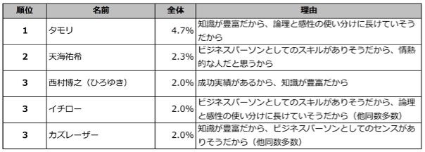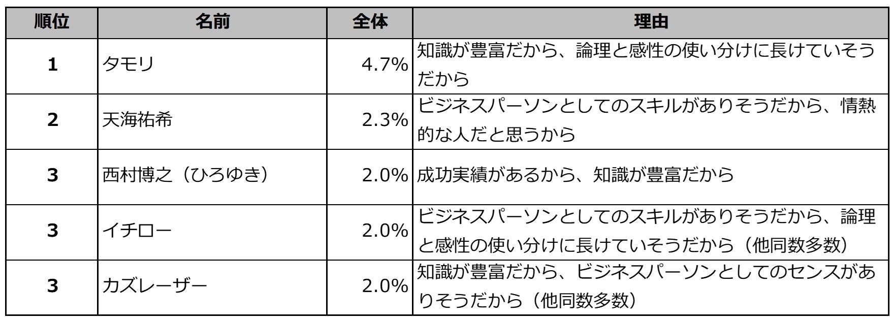 一緒に働いてみたいと思う芸能人ランキング1位は「タモリ」(4.7%)となり、次いで、2位が「天海祐希」(2.3%)、3位が「西村博之(ひろゆき)」、「イチロー」、「カズレーサー」(同2.0%)となりました。選定の理由には、「知識が豊富だから」「ビジネスパーソンとしてのスキルがありそうだから」「論理と感性の使い分けに長けて良そうだから」などの回答が得られました。