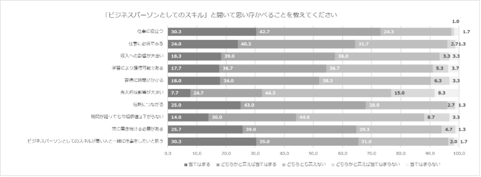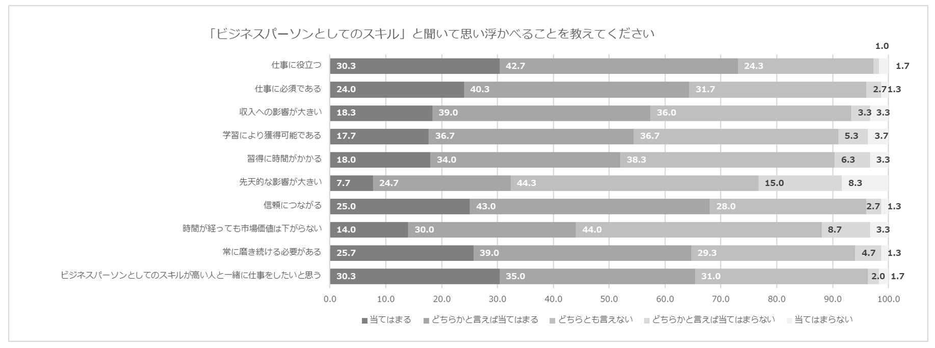 ビジネスパーソンとしてのスキルと聞いて思い浮かべることとして「仕事に役立つ」「スキルが高い人と働きたい」に「当てはまる」(30.3%)が同率で並び、「信頼につながる」(25%)が続きました。当てはまる、やや当てはまるまで広げるとスキルが「仕事に役立つ」と考えている層は73%の多数を占めており、ビジネスにおける「スキル」の重要度が分かる結果となりました。