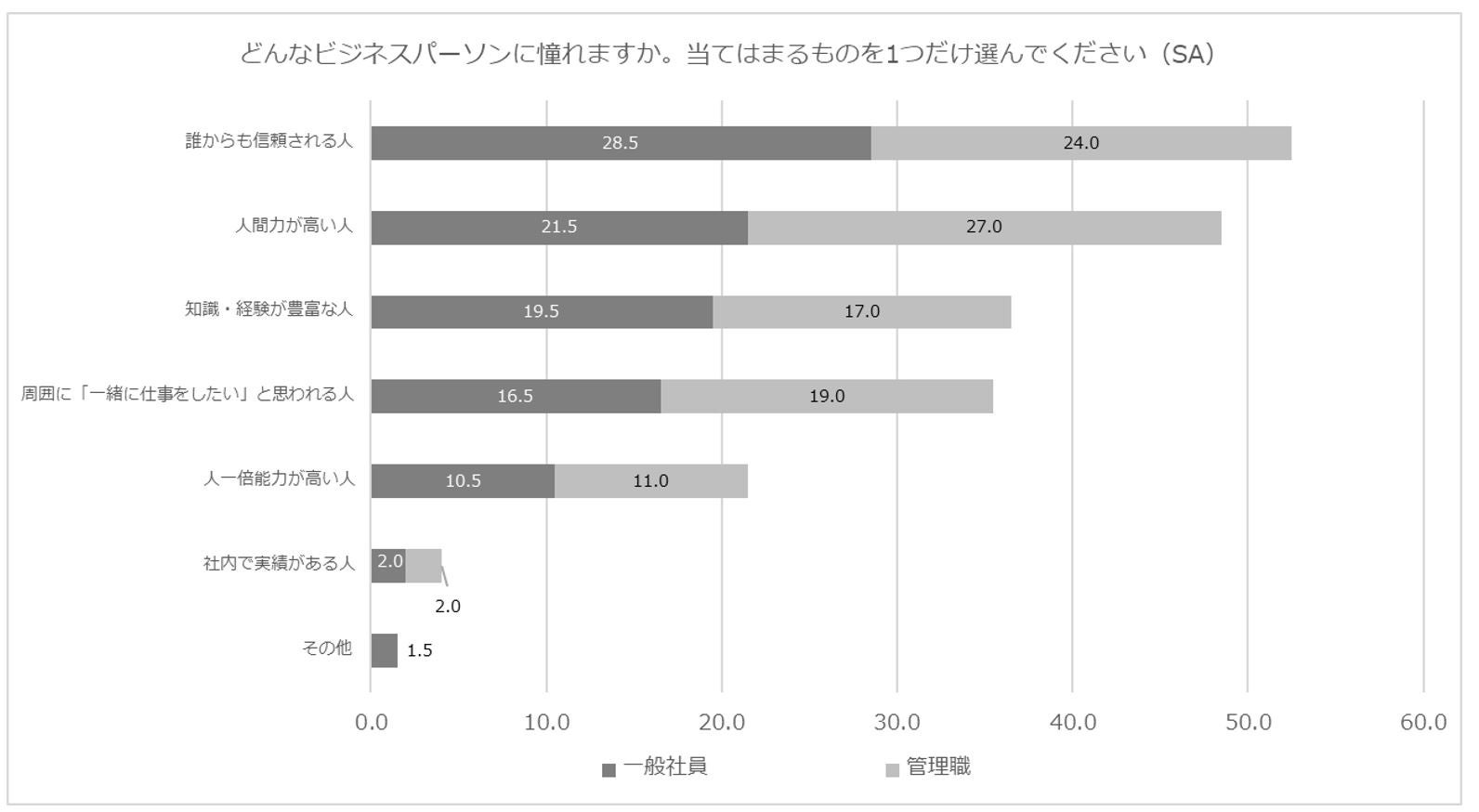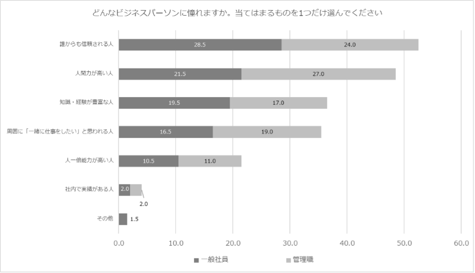 一般社員の56%に比べ14ポイント高い結果に - 管理職が憧れるビジネスパーソン1位は「人間力が高い人物」