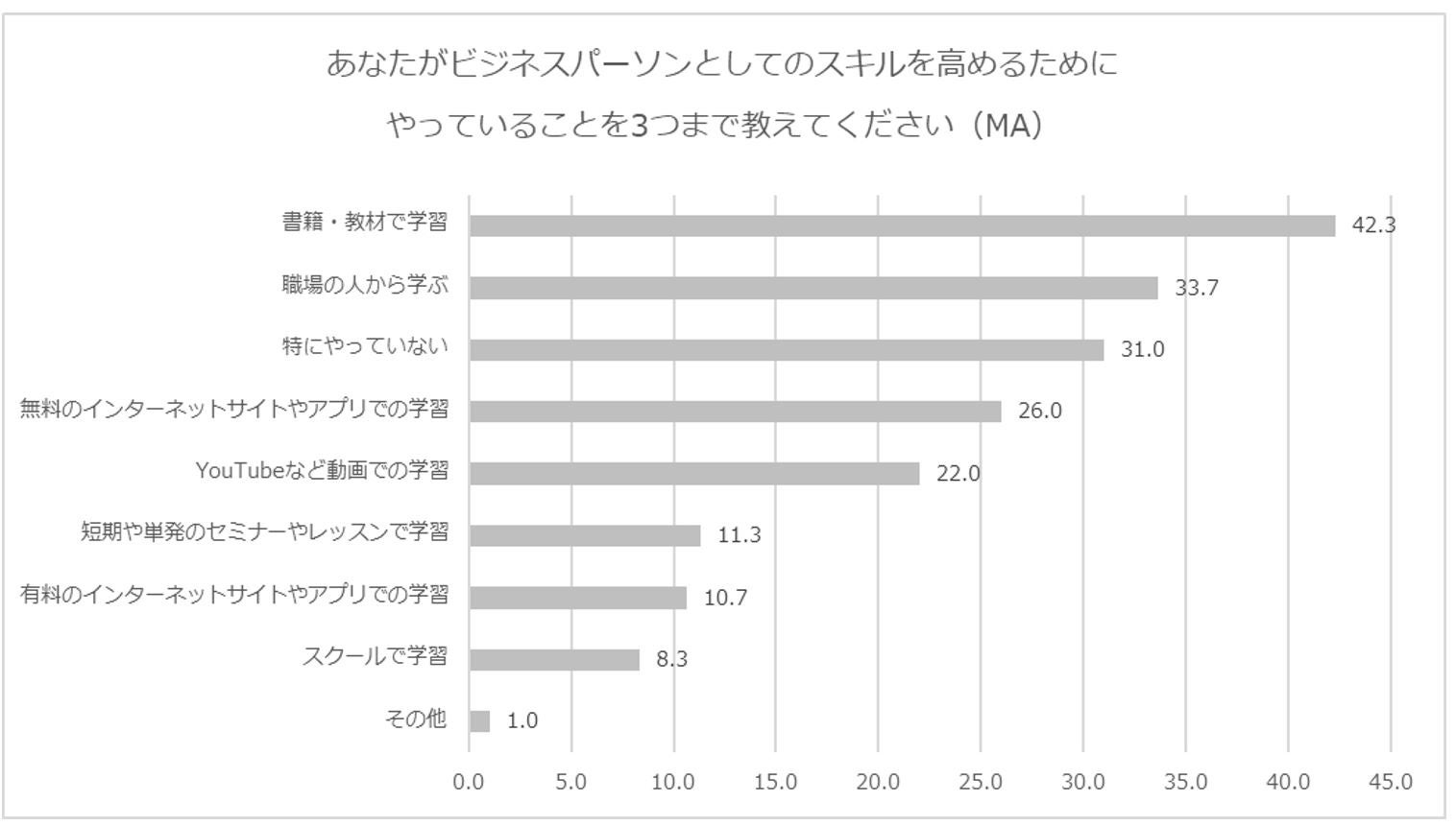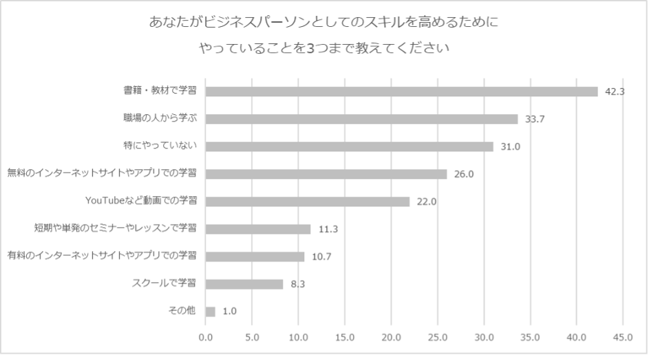 - スキルを高めるためにやっていることについて「書籍・教材で学習」が42.3%で最も高く、次いで「職場の人から学ぶ」が33.7%。一方で「特にやっていない人」は31%という結果に