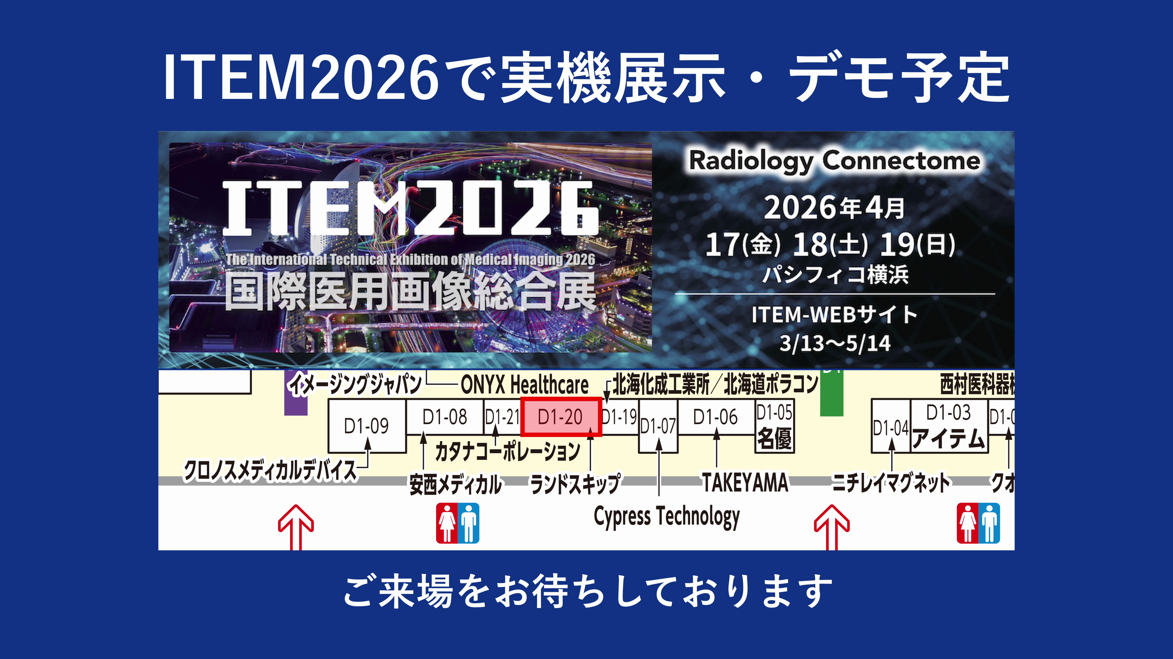 「あんないAI」は、2026年4月17日~19日にパシフィコ横浜で開催される、国際医用画像総合展「ITEM2026」にて実機展示およびデモンストレーションを予定しております。会場では、音声による案内や画面表示の操作を実際にご体験いただけます。