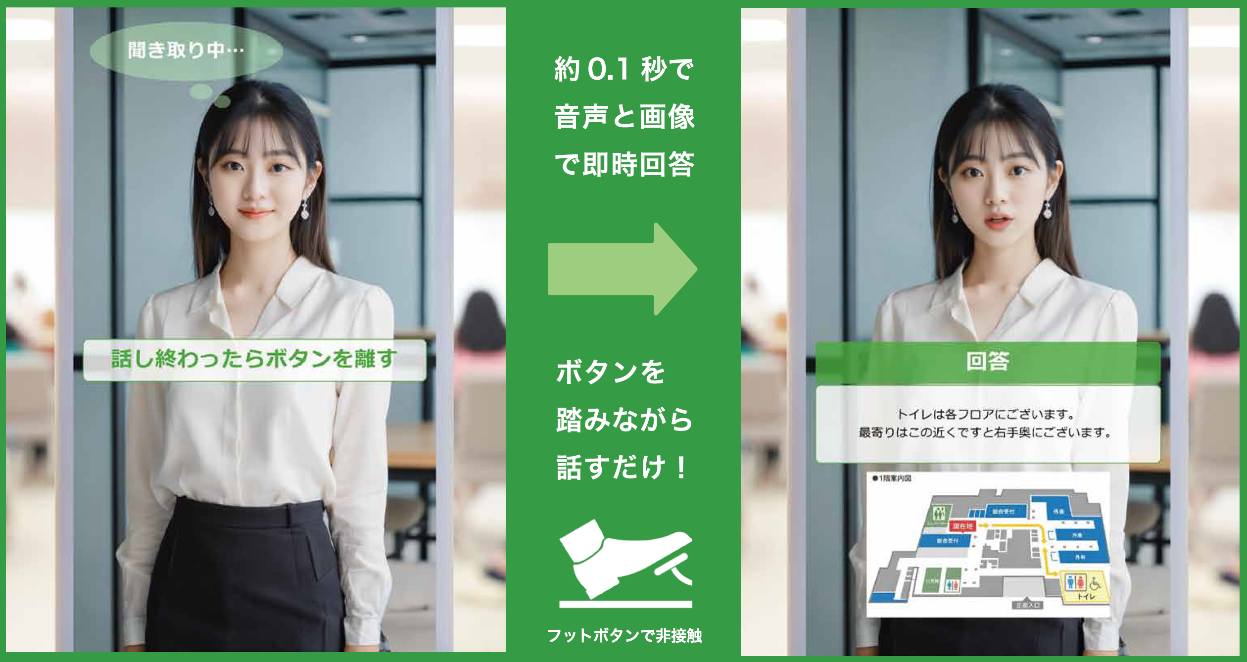 院内専用のQ&Aデータに基づく正確な案内に加え、音声対話と画面表示による直感的な操作、フットボタンによる非接触操作、迅速な応対を実現し、医療現場でも安心して利用できる設計となっています。