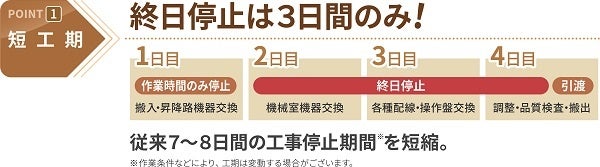 東芝エレベータ株式会社(社長:川﨑幹 本社:神奈川県川崎市)は、エレベーターのリニューアルで工事期間中の終日停止時間を従来の7~8日間から3日間に短縮した制御リニューアルプラン「時短リニューアル」の適用を拡大した商品を4月から発売します。