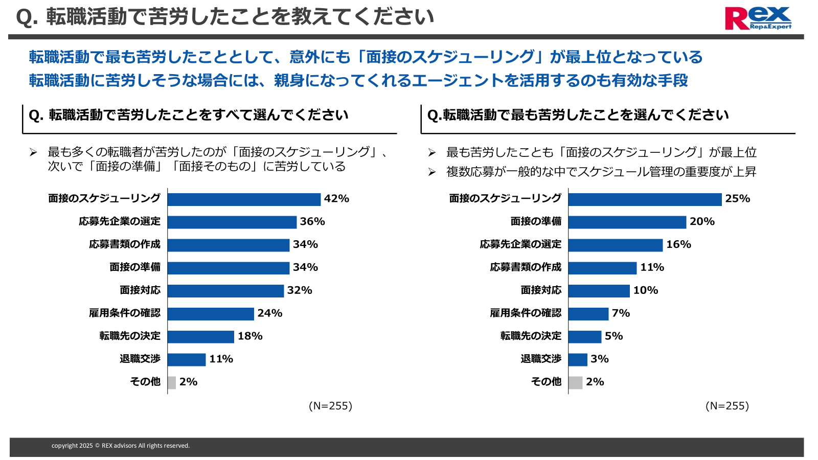 転職活動において最も苦労したことにおいても、応募先選定(25%)、スケジューリング(20%)、(書類作成16%)、面接準備(11%)で全体の7割を占める