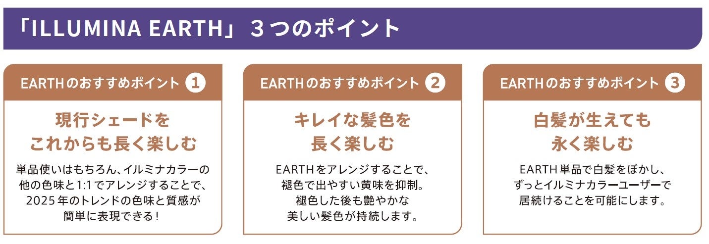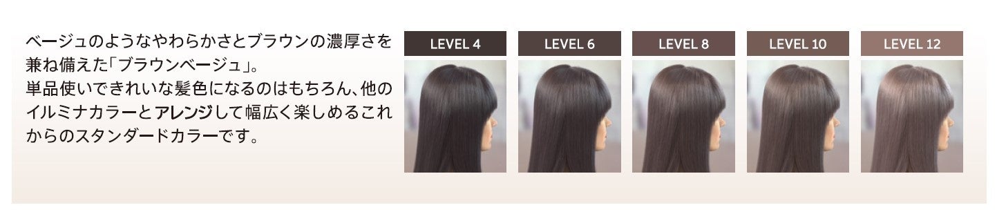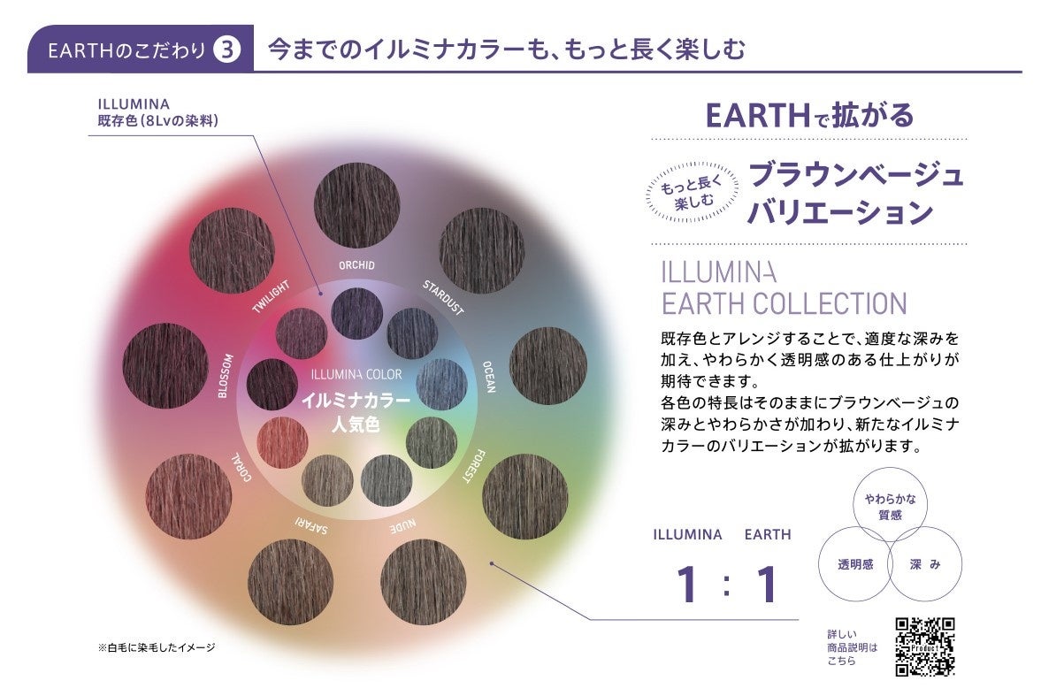 今回新発売される「アース」は、イルミナカラーの中で最も汎用性が高いニュートラルカラーとして誕生。ベージュやブラウンのトレンドを踏まえつつ、より髪本来の美しさを引き出したいという消費者のニーズを叶えます。トレンドの「王道ブラウンベージュ」が1本で簡単に表現できるのに加え、イルミナカラーの他の色とアレンジすることでバリエーション豊かなブラウンベージュをアースコレクションとして展開。また、「アース」をアレンジすることで、褪色時に出やすい黄味を抑制し、艶やかな美しい髪色、質感を持続させることができます。4、6、8、10、12明度と豊かなラインナップで、白髪染めからトーンダウンまで様々なニーズに対応可能です。「アースコレクション」であなたの理想のブラウンベージュをもっと長く美しく楽しんでみませんか。