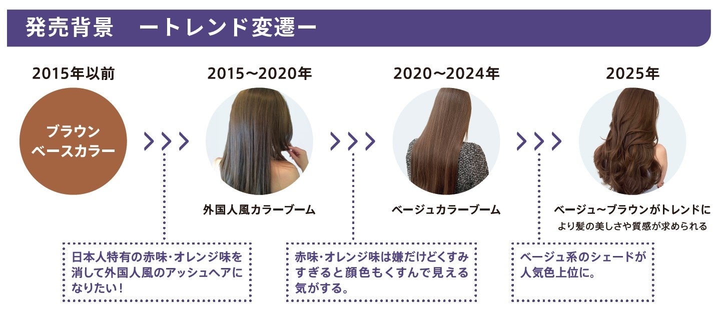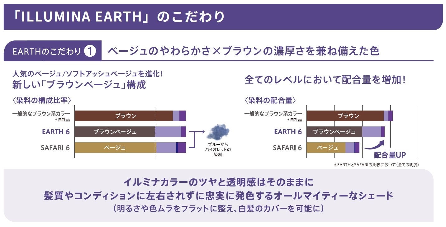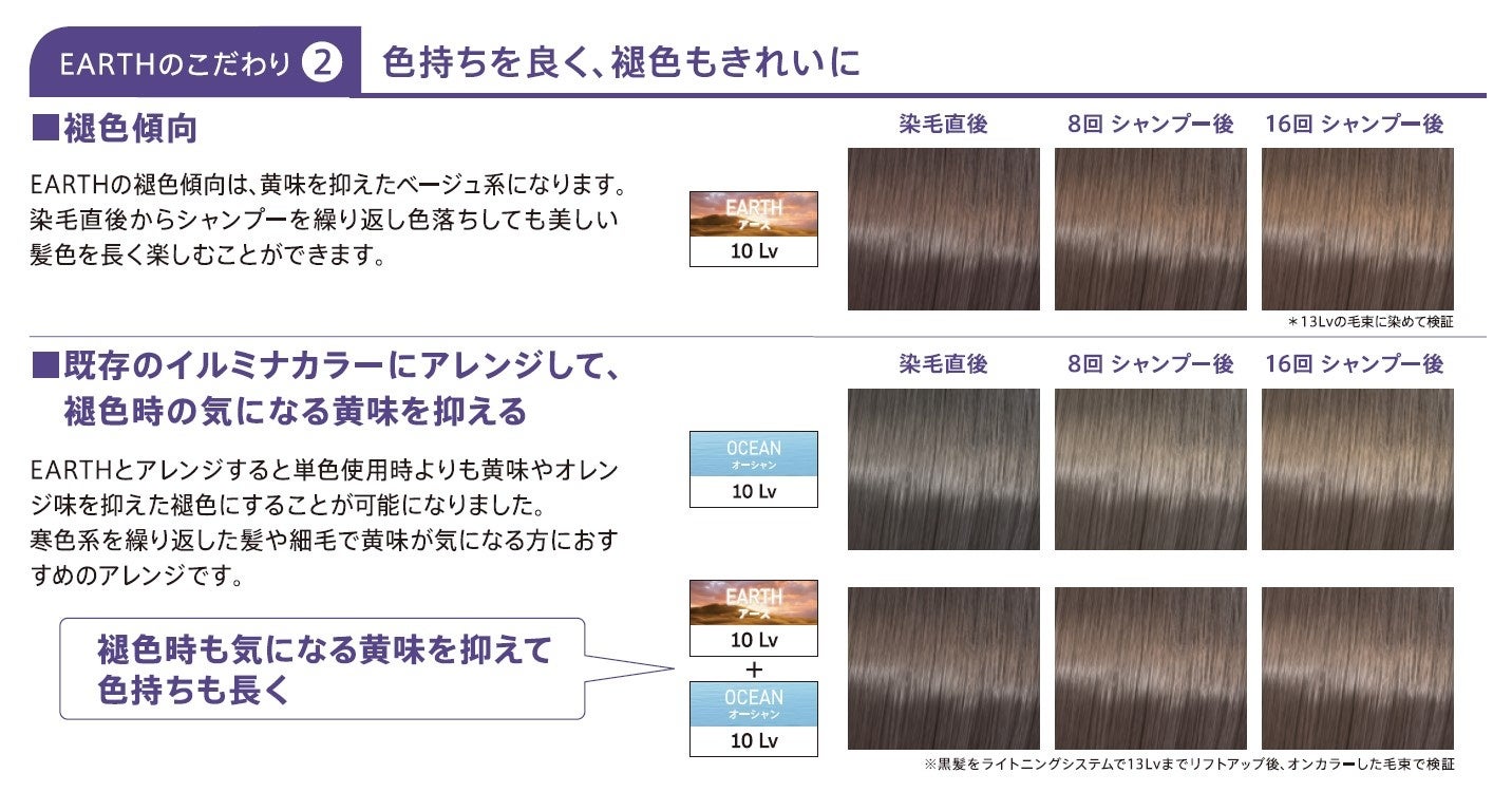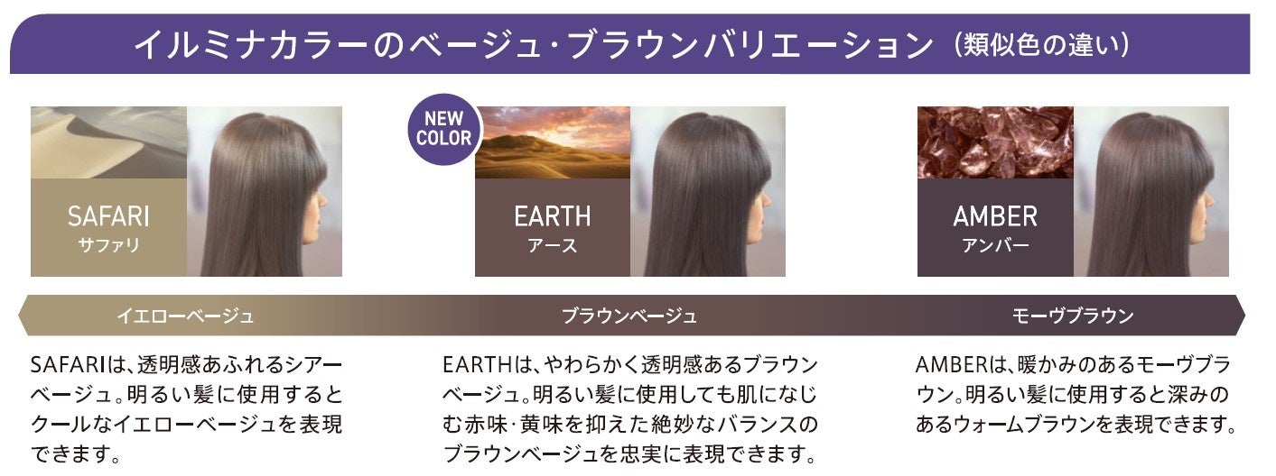 新色「アース」は、赤味と黄味を抑えた絶妙なバランスが特徴で、ベージュのようなやわらかさとブラウンの濃厚さを兼ね備えた上品なブラウンベージュです。色持ちが良く、褪色しても美しい髪色を長く楽しんでいただけます。また、既存シェードとアレンジすることで深みと透明感が加わったカラーを表現することができます。