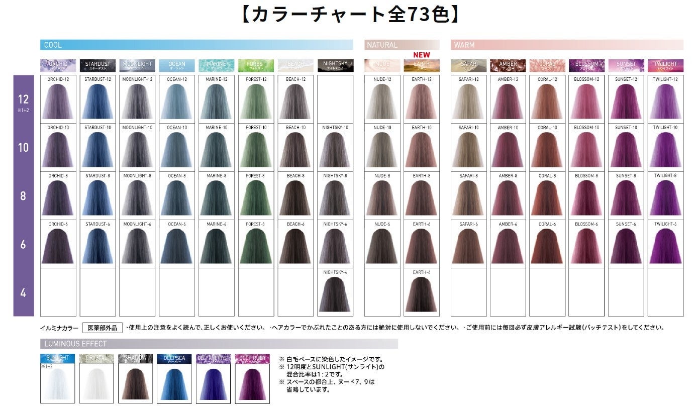 カラーリングの負担に配慮しつつ、日本人特有の固く見えやすい髪も自然な光があふれる髪へ仕上げ、肌をきれいにみせてくれる「イルミナカラー」。今回1シェード加わり、全22シェード、73色になりました。