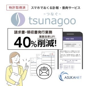 『tsunagoo』は従来紙面に印刷するのが常識であった訃報をWebページとして生成、そこから弔電、供物、香典受付までスマホで完結でき、喪家や会葬者と葬儀社様の双方にとって非常に便利なサービスです。