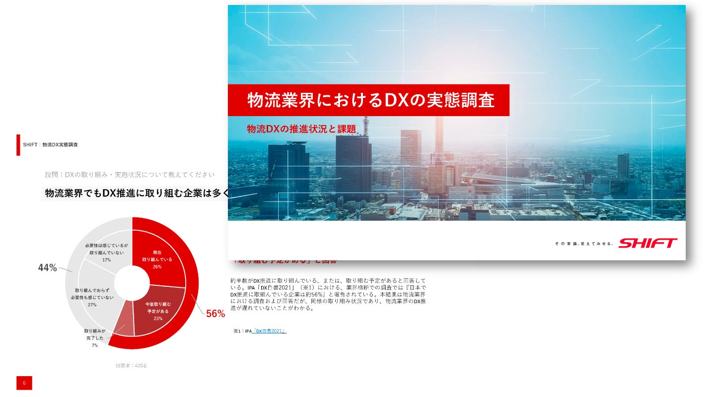 お客様の売れるソフトウェアサービス/製品づくりを支援する株式会社SHIFT(本社:東京都港区、代表取締役社長:丹下 大、プライム市場:3697、以下 SHIFT)は、2021年12月に物流業界に所属する企業の経営・ビジネス企画、ソフトウェア・システム開発に携わる役職者を対象として、DX推進の取り組み状況に関する調査を実施しました。その調査結果を、調査レポート「物流業界におけるDXの実態調査(物流DXの推進状況と課題)」にまとめましたのでお知らせします。