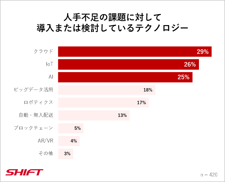 - 人手不足の課題に対して、導入または検討しているテクノロジー:インフラ基盤の変更やデータ統合を伴う最新技術