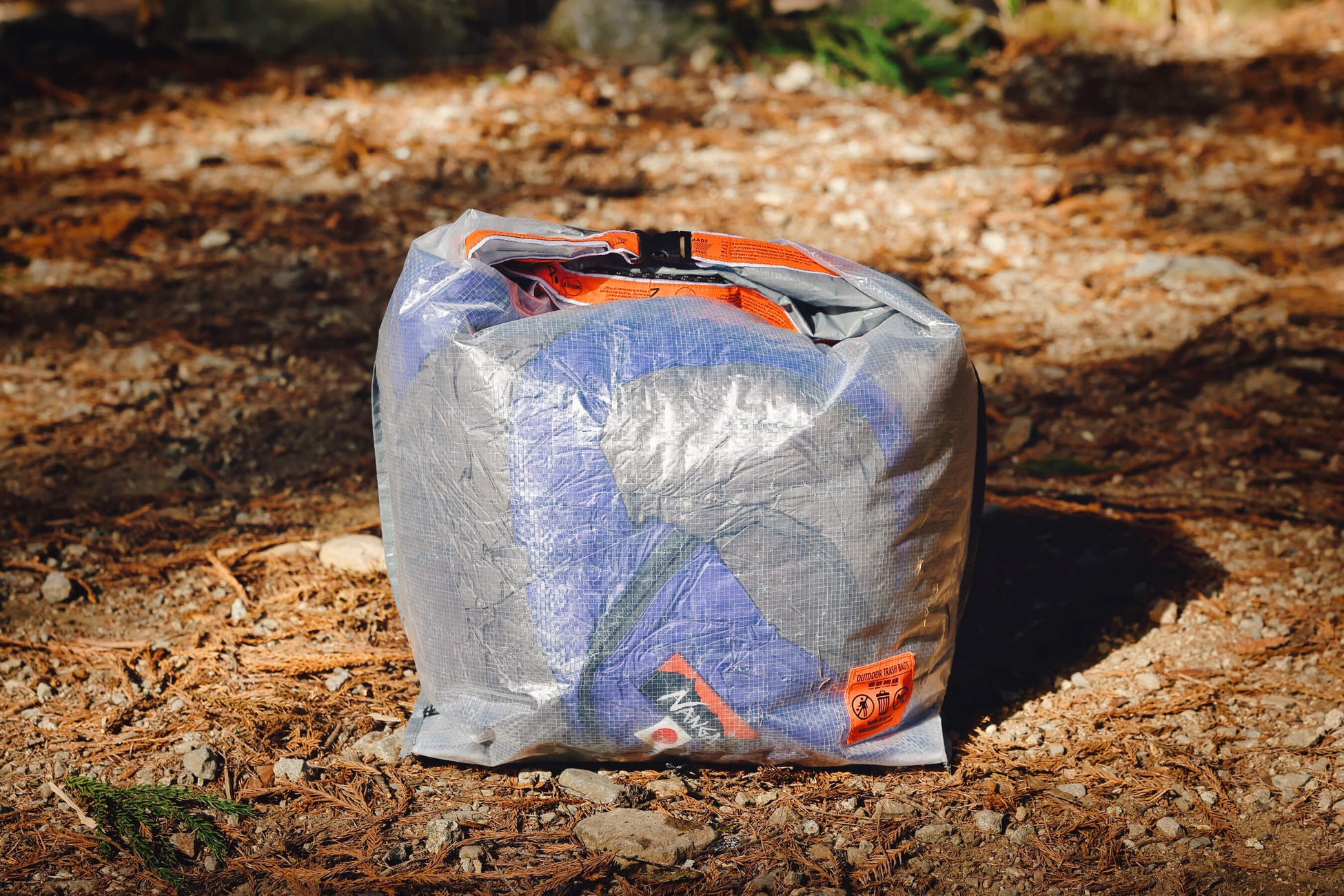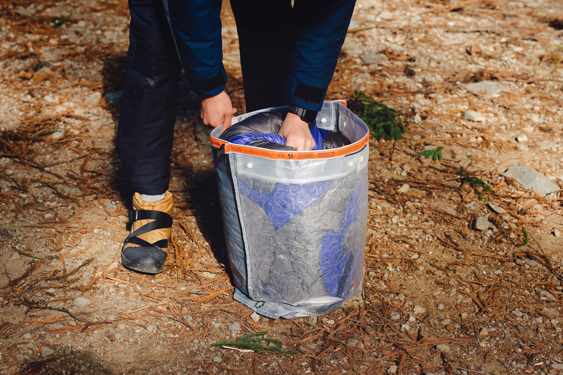 ロールトップ式が採用されているので、コンプレッションできるのもの魅力のひとつ。ぎゅっと圧縮してシュラフなどのダウン製品をもっとコンパクトにまとめることも可能です。半透明で内容物がわかりやすいのはもちろん、キャンプギア棚での見せる収納にも一役買ってくれるはずです。