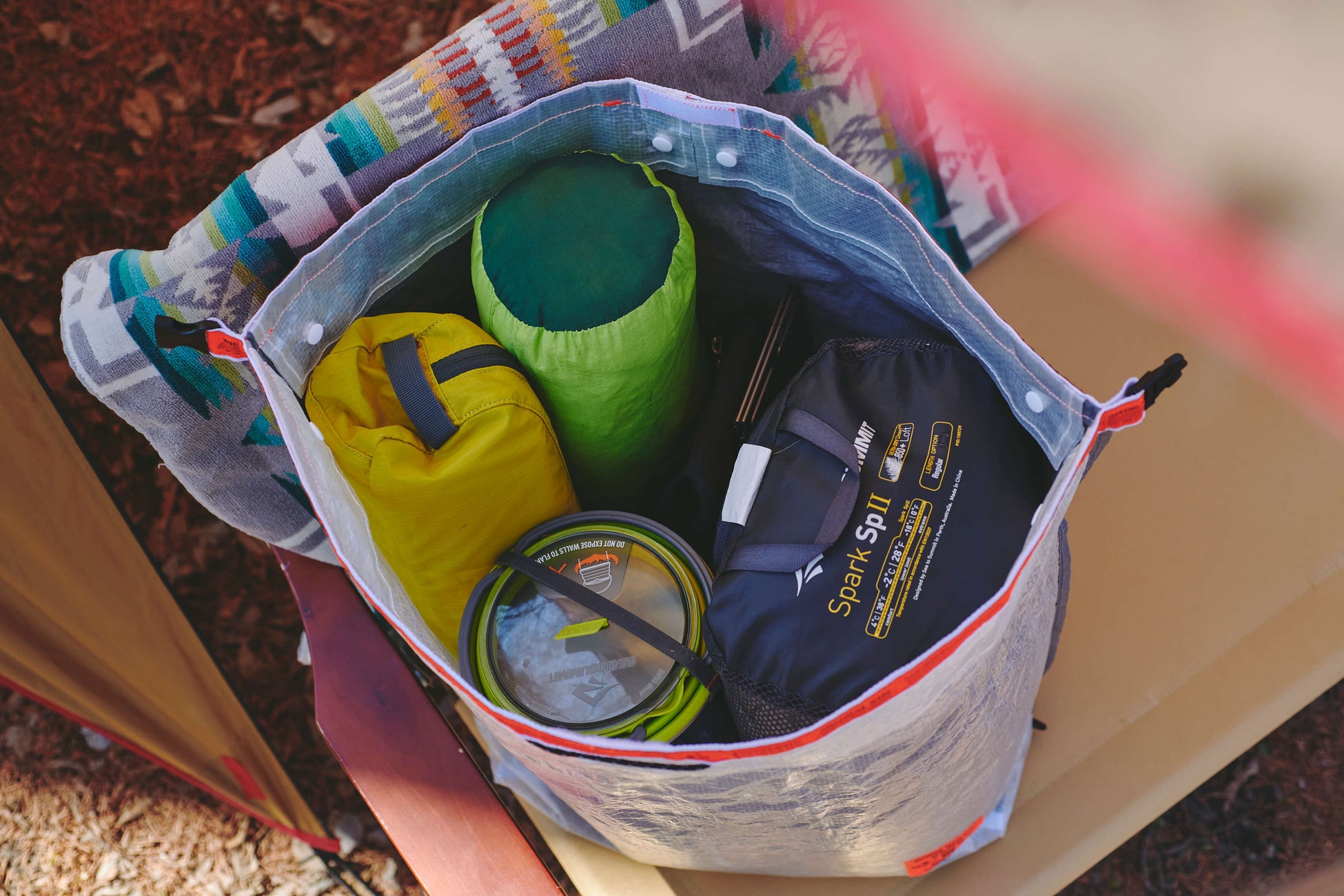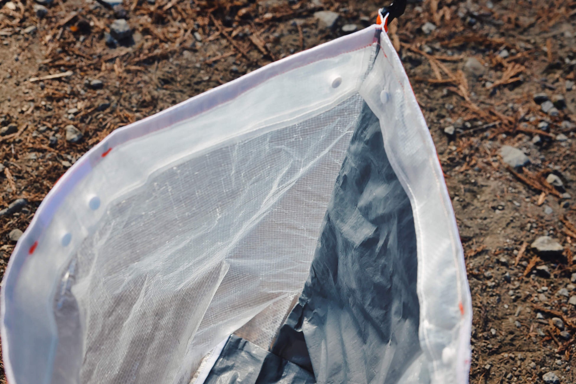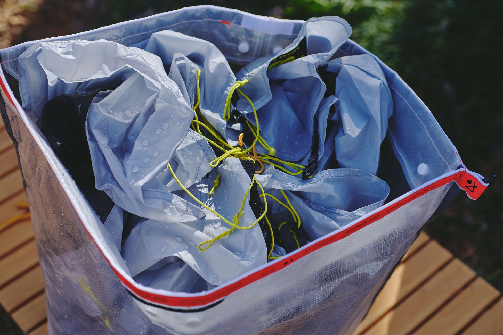 例えば、写真のように濡れたテントなどをそのまま押し込めば撤収作業がずっとスマートに。帰宅中に車内やほかの荷物を濡らしてしまうような二次被害も防げるので、おうちでの後片付けもはかどります。