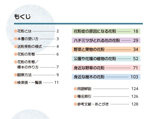 花粉症の原因となるスギやブタクサ、身近な場所で見ることができるセイヨウタンポポや代表的な桜のソメイヨシノまで、身の回りの植物の花粉を紹介しています。巻頭には花粉の形と大きさから種名を検索できる「検索表・一覧表」を収録しました。