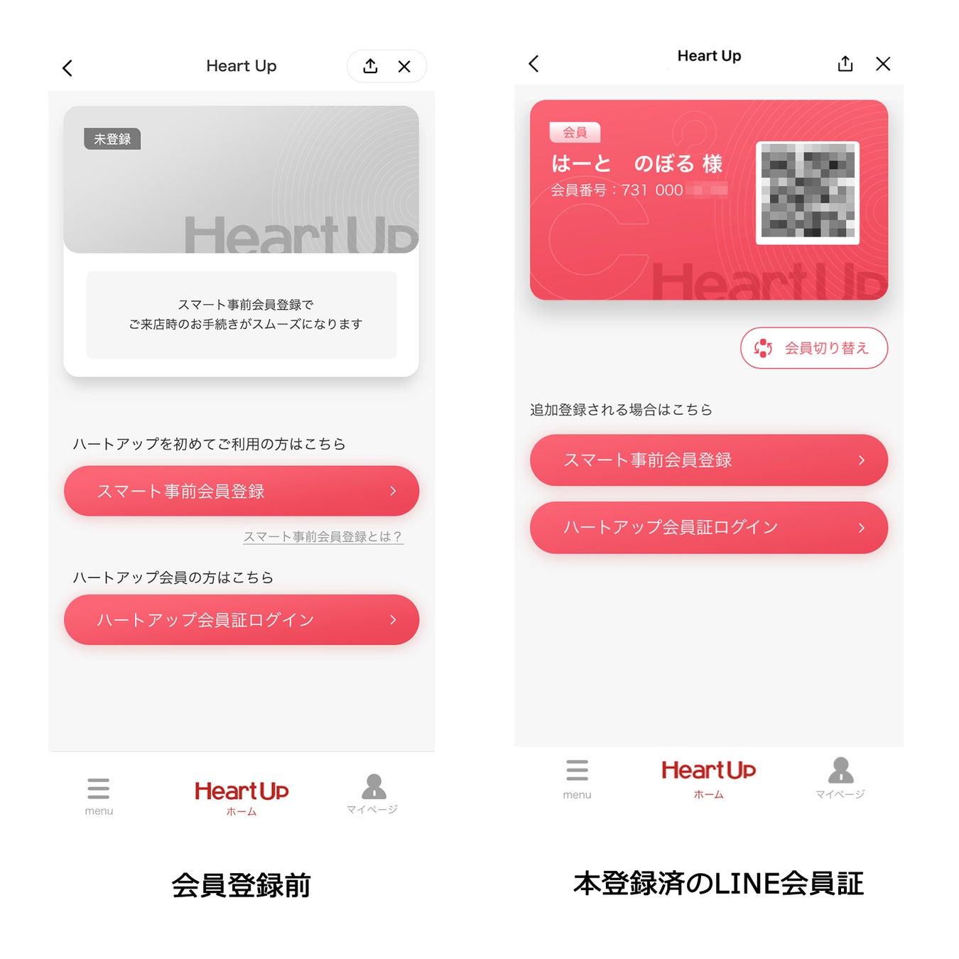 すでにハートアップに登録済みの会員は、ログイン機能によって「ハ―トアップ」のLINEミニアプリに会員証を表示できるので、紙の会員証を持ち運ぶ必要がなくなります。