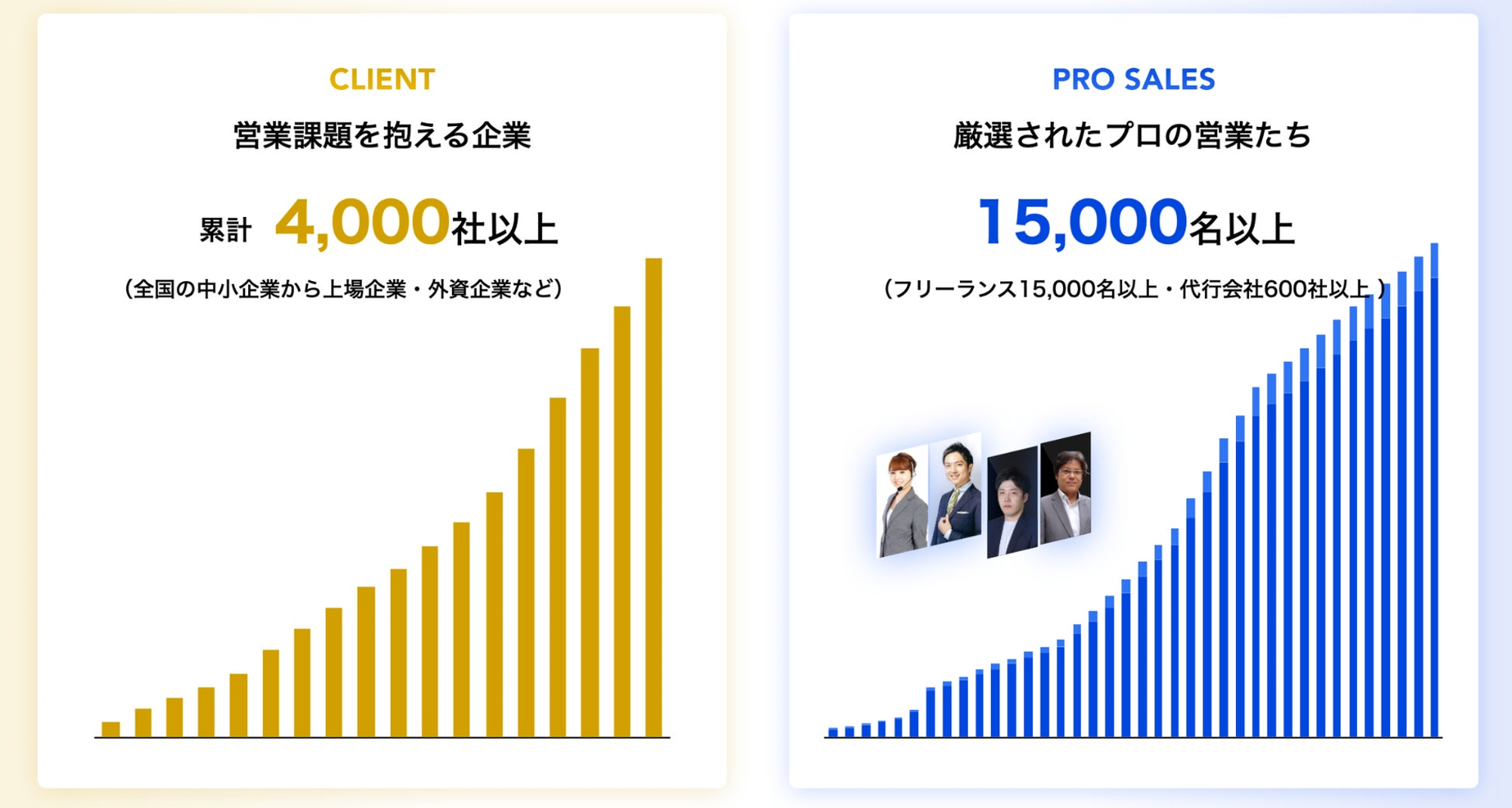 フリーランス営業職・営業代行会社と企業を繋ぐ国内最大級の営業代行プラットフォーム。1.5万人を超えるフリーランス・副業の営業人材、600社以上の営業代行会社が登録しています。企業側は最短7日で新規開拓からクロージング、営業戦略まで、すべての営業プロセスをアウトソースすることができます。