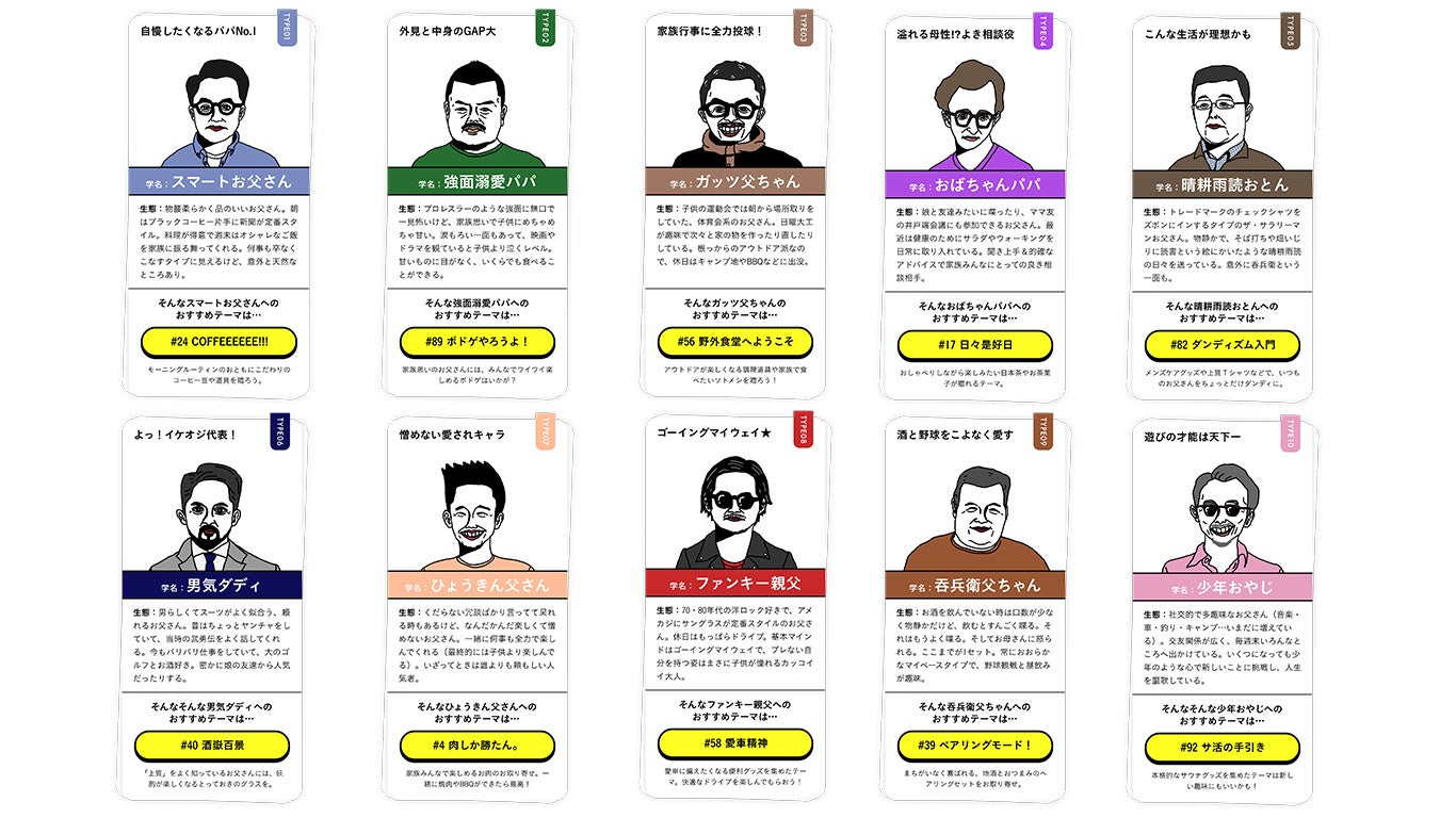 そこで《dōzo》では、お父さんのタイプを「強面溺愛パパ」や「おばちゃんパパ」など《dōzo》独自に10タイプに絞り込み、自分の父親と近いタイプの“お父さん像”から簡単にギフトが選べる「お父さん図鑑」を6月2日(金)より公開します。