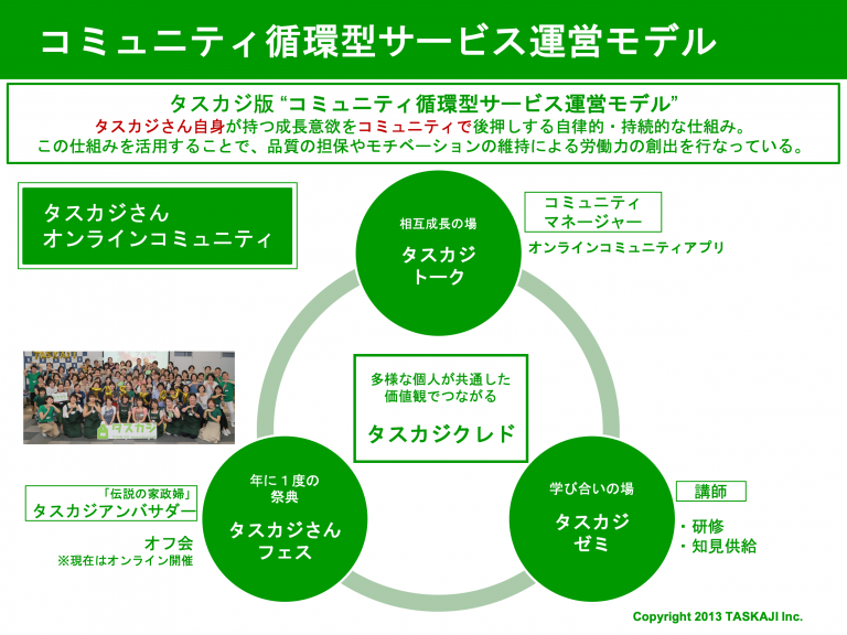 ・タスカジさんはフリーランスでタスカジ社と雇用関係にないため品質コントロールが難しいのですが、「コミュニティ循環型サービス運営モデル」