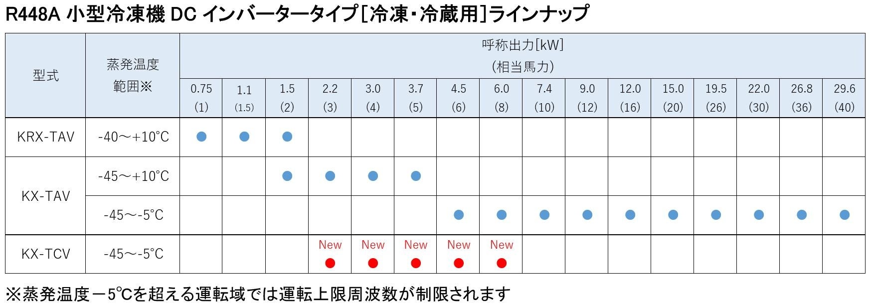 仕様表の冷凍能力は蒸発温度-40℃、外気32℃において一般社団法人 日本冷凍空調工業会標準規格 コンデンシングユニット JRA 4019:2020で測定した値になります。