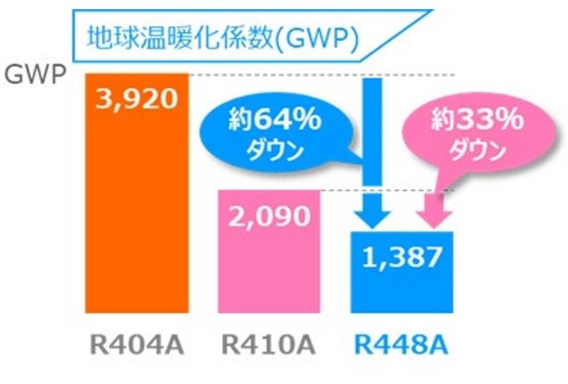 不燃性※1の新冷媒R448Aは、GWP(地球温暖化係数)※2,3 1,387と従来の冷媒R404Aに比べて約64%、冷媒R410Aに比べて約33%低減した冷媒です。
