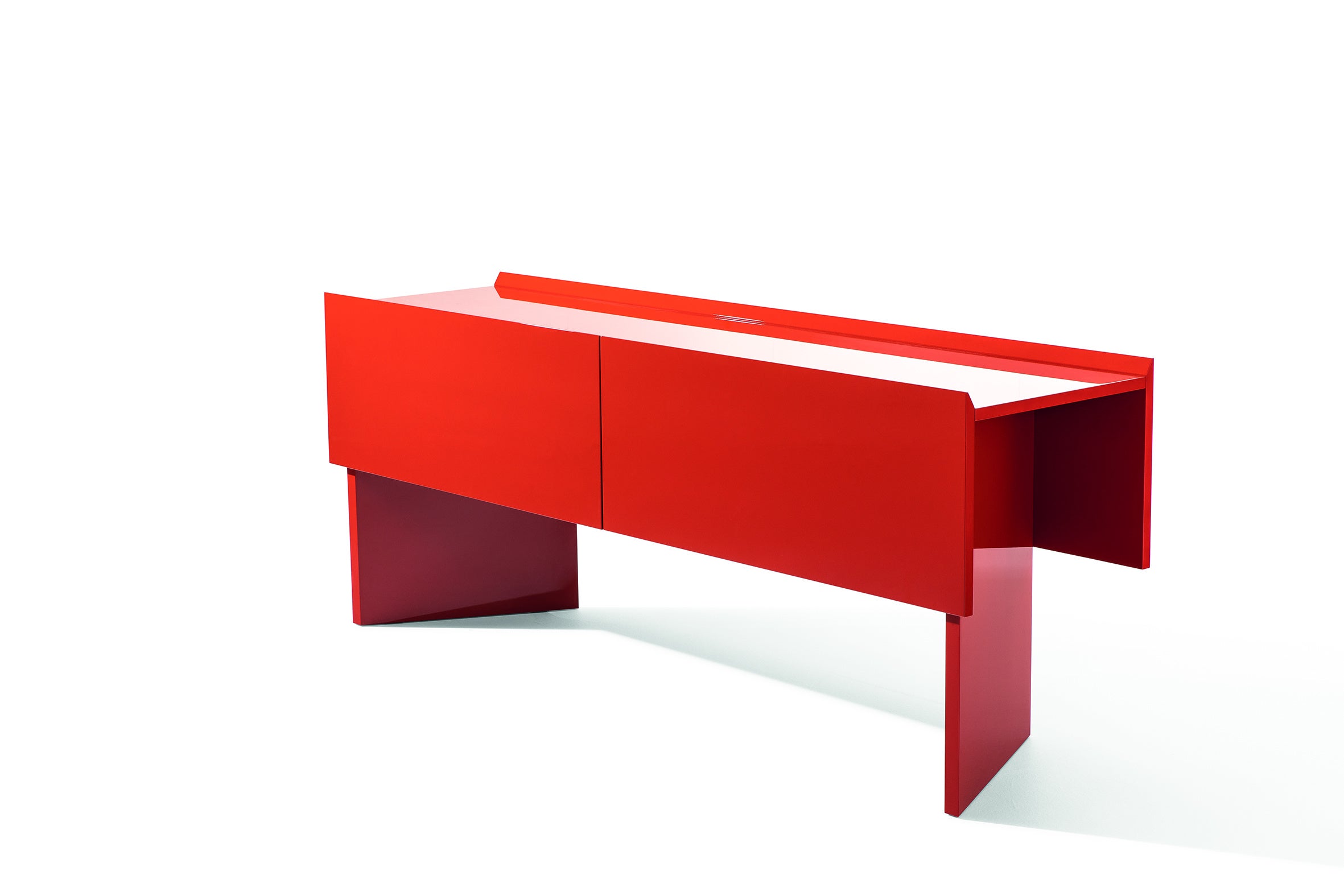 この幾何学的なキャビネットのデザインには、日本の影響が見て取れます。伝統的な羽織のように、ボリュームと引き算を演出するカットが特徴。箱の部分に対して斜めに配置された脚部は、シンプルでエレガントな印象を与えます。一見ミニマルに見えますが、薄くデザイン加工されたエッジが外観を軽やかに見せ、しっかりとしたフォルムが際立っています。