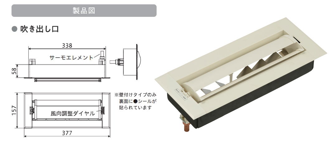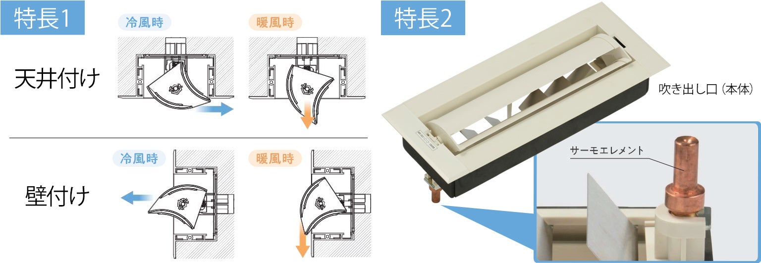 吹き出しユニットは、「吹き出し口(天井用・壁用)」と、「チャンバーボックス」を組み合わせてご使用いただく製品です。風の温度で風向を自動変更するのが特長です。これまで「手動や電動で風向調整する」製品はありました。しかし、最適な風向管理には住まい手の操作調整が必要となり、「全館空調や計画換気を導入しても、なかなか高効率な風向管理が行えない」という課題がありました。当製品は「冷房は頭上から、暖房は足元から風を送る」という理想の空調管理を自動で実現する製品です。また、風向を変更する駆動装置には、非電動でノーエネルギー駆動を実現するサーモエレメント(※1)を採用しています。