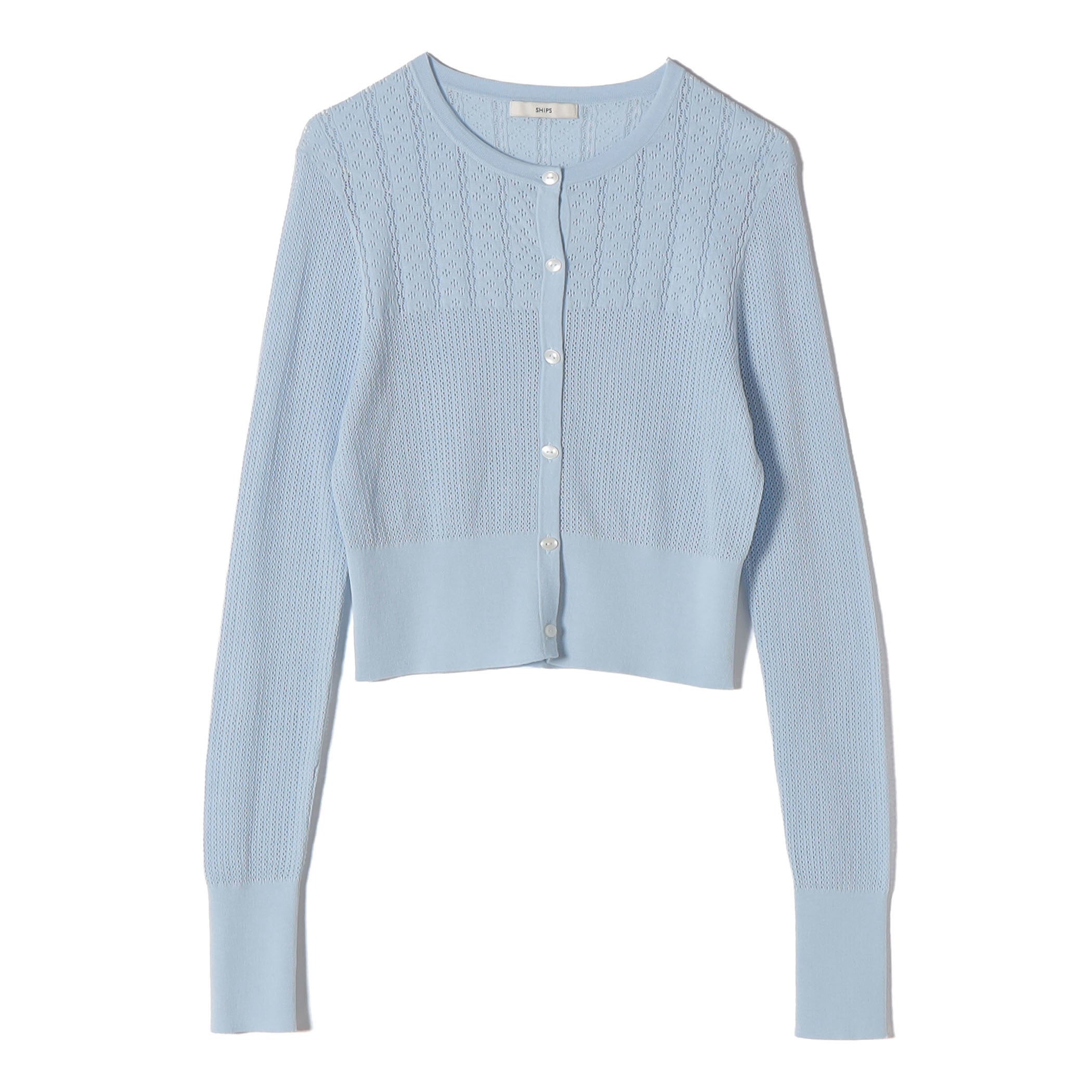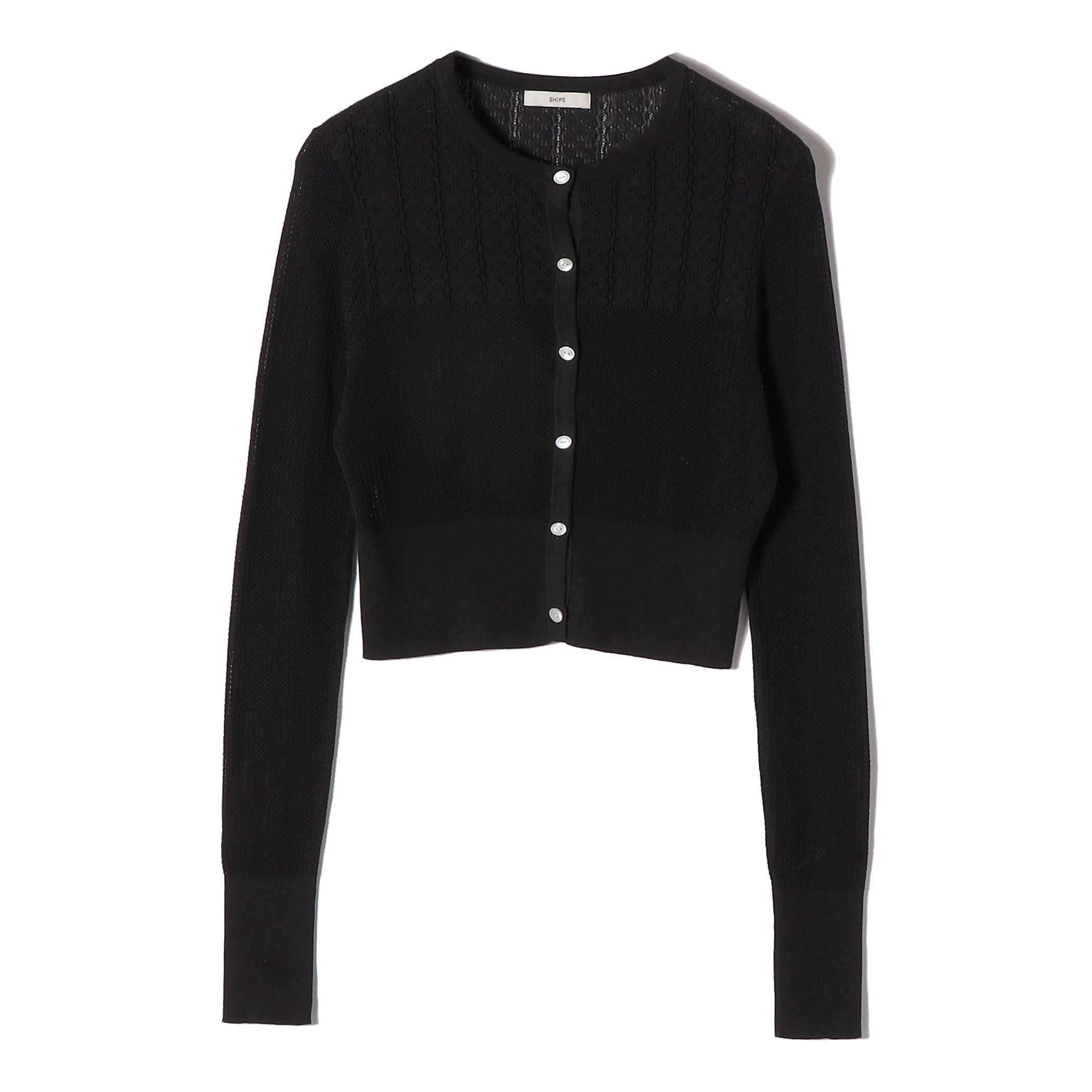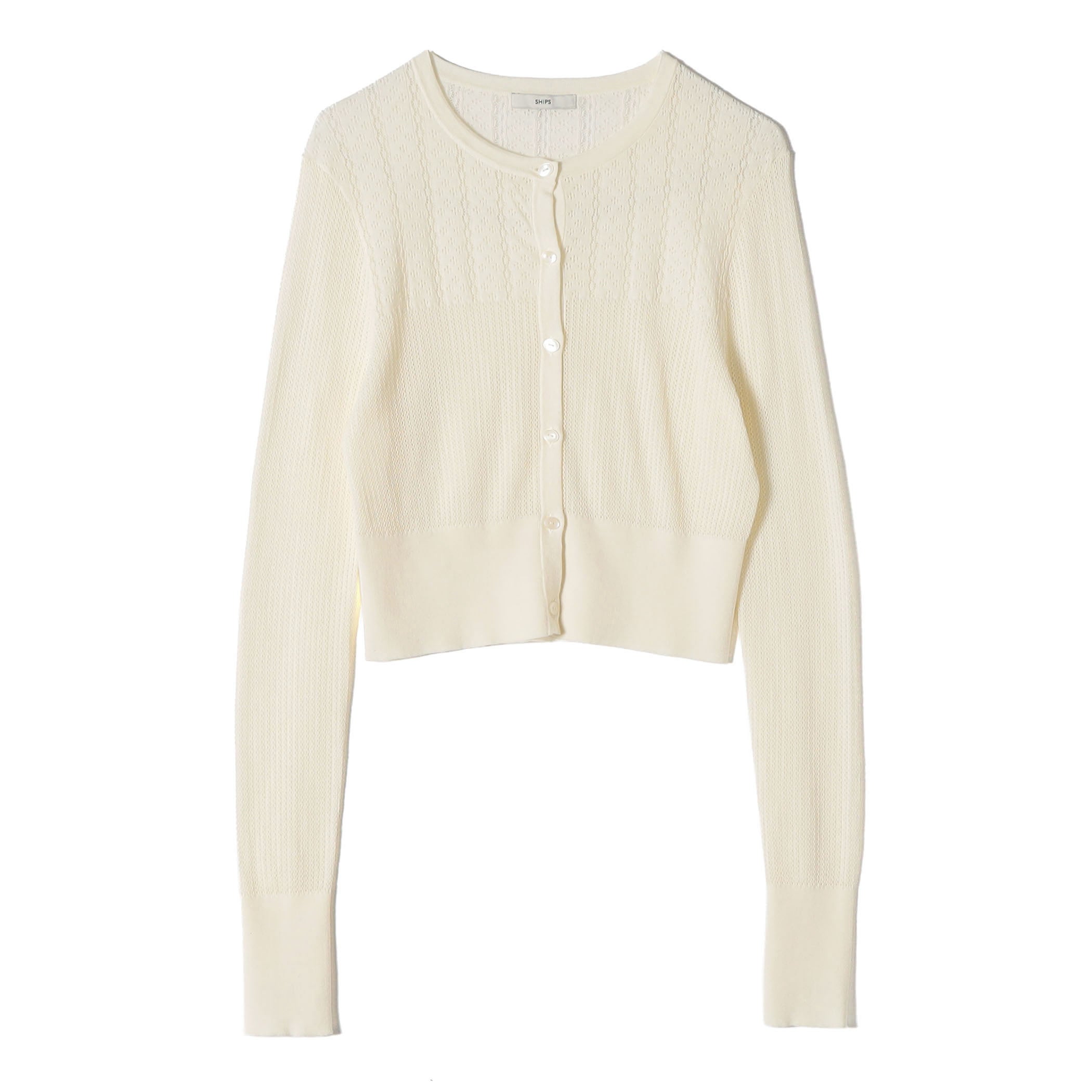 レースのような透け感のある編地を組み合わせた、軽やかで存在感のあるカーディガン。コーディネートの主役としても活躍します。繊維長の長い綿100%素材を使用し、特殊な紡績技術で毛羽立ちを抑えることで、シルクのような光沢と滑らかな肌触りを実現。さらに、細番手の綿糸を3本撚り合わせ、さらりとしたシャリ感と美しい表面感を両立しました。裾は太めのリブ仕様で、ウエスト位置を高く見せるバランスの良いシルエットに。春はもちろん、夏の暑い時季にもさっとバッグに入れて持ち歩ける、頼れる一着です。