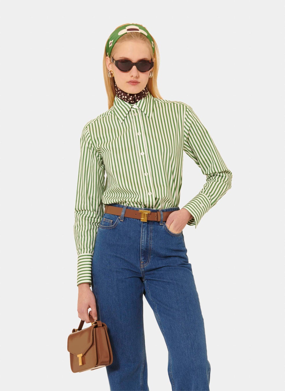 カフスにあしらったTJマークの刺繍、美しいグリーンカラーとこだわりのストライプ配置が特徴的なインポートらしいブラウス
