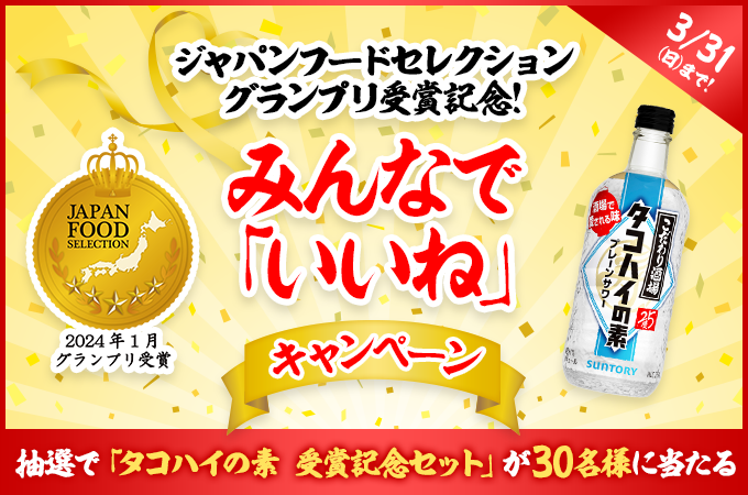 一般社団法人日本フードアナリスト協会が主催する「第71回ジャパン・フード・セレクション(2024年1月)」において、「こだわり酒場のタコハイの素」が最高評価であるグランプリを受賞したことを祝して、たくさんの方に一緒に受賞を喜んでもらいたいという思いから、コミュニティでの受賞記念キャンペーンを実施するに至りました。