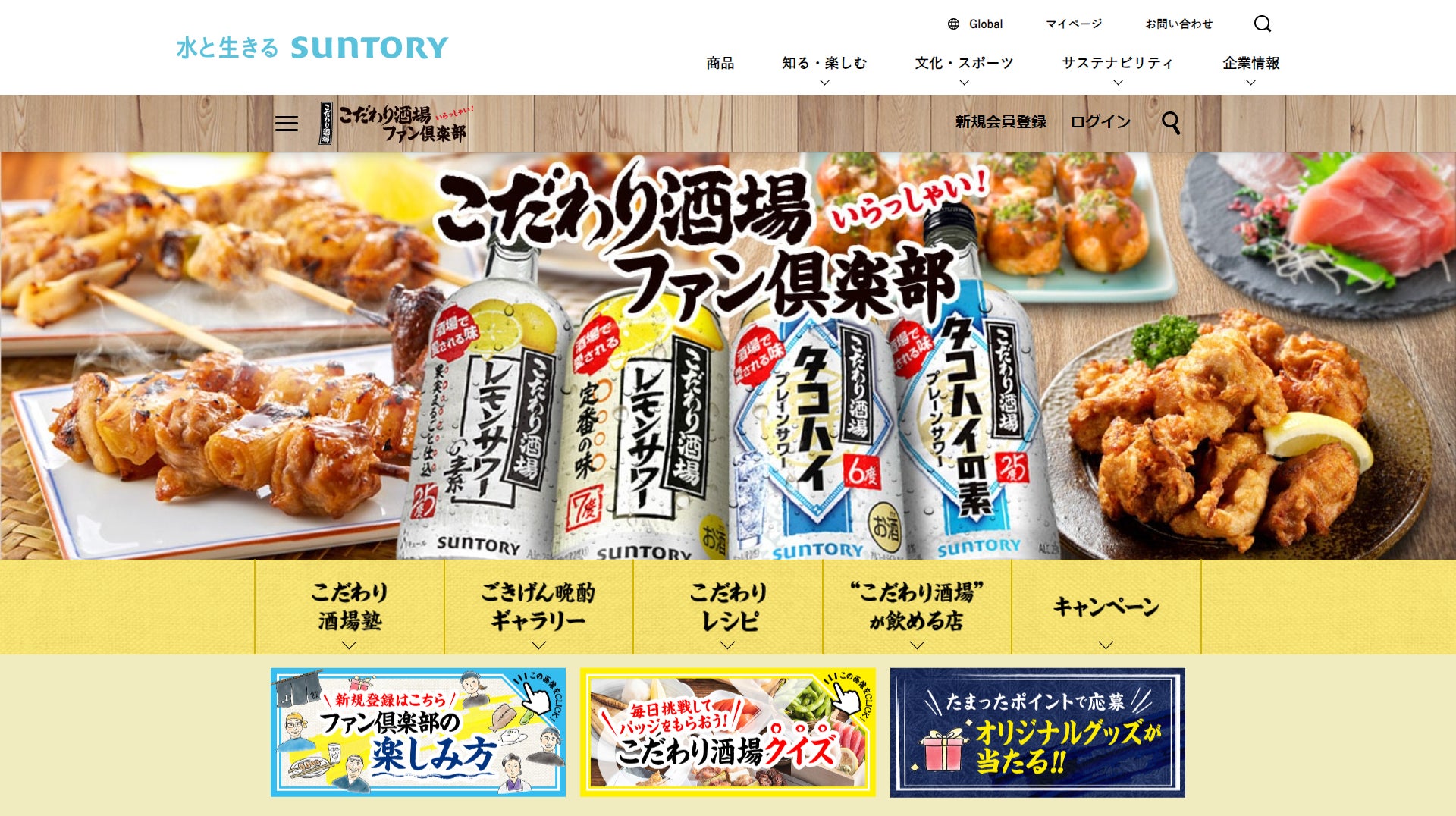 レモンありのままでしっかりお酒「こだわり酒場のレモンサワー」、酒場で愛される“味わいプレーンサワー” 「こだわり酒場のタコハイ」。これらの「こだわり酒場」ブランドを愛する人たちが集まるコミュニティ。サイト全体を居酒屋風にデザインし、「こだわり酒場」が持つ世界観を伝えている。