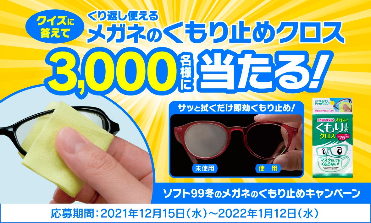 このたび、株式会社ソフト99コーポレーション(代表取締役社長:田中 秀明)は、メガネがくもったその時にサッとレンズを拭くだけでくもりを解消できる『くり返し使える メガネのくもり止めクロス』の確かな性能をより多くの方にご体感いただけるよう、同商品が3,000名様に当たるプレゼントキャンペーンを12月15日(水)より実施いたします。