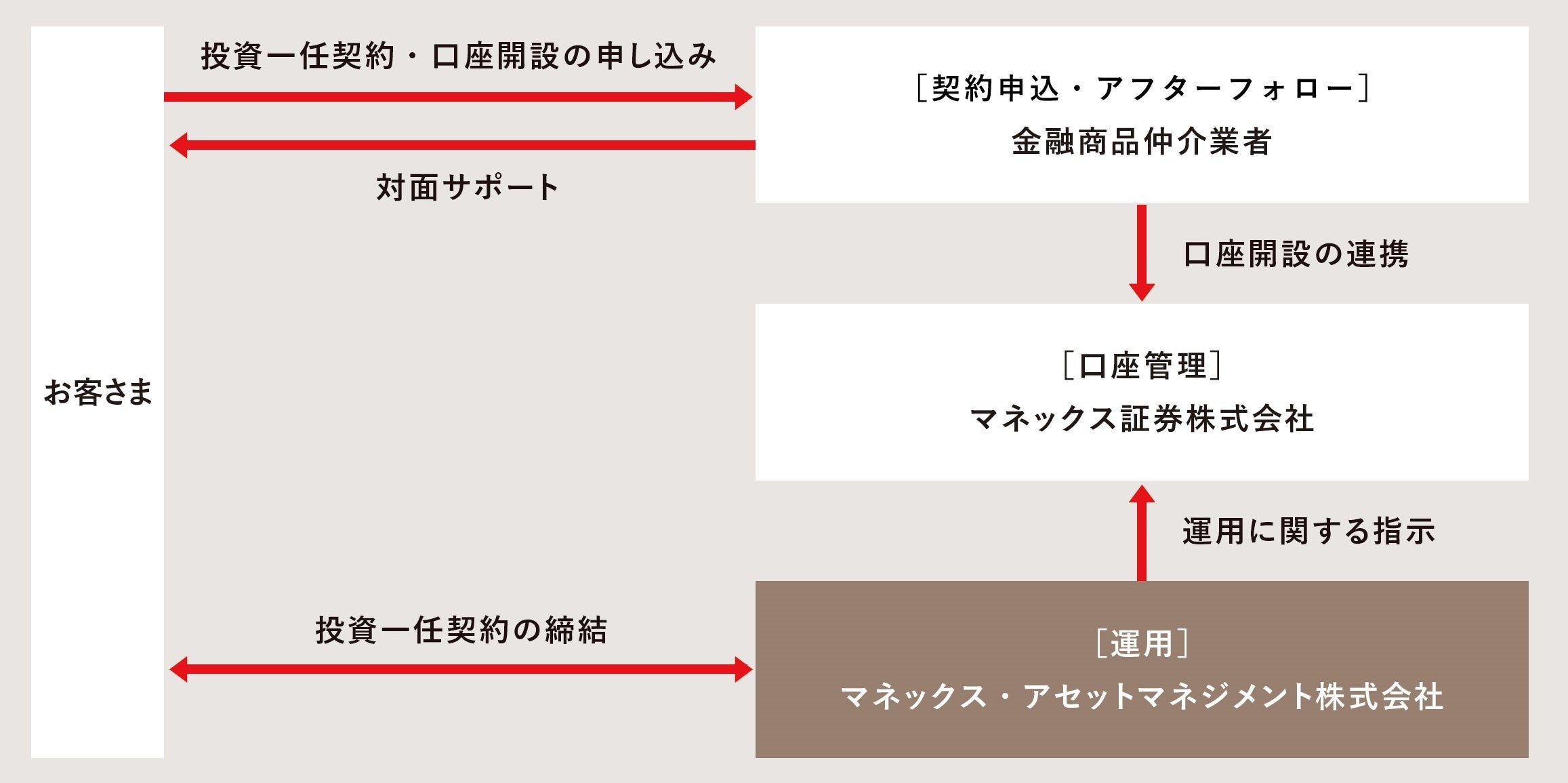 資産運用計画のコンサルティングは、マネックス・アセットマネジメントが提供するコンサルティングツールを活用してマネックス証券が契約するIFA法人のアドバイザーが行い、対面によりお客さまの不安やお悩みにお応えします。運用開始後も、アドバイザーによるアフターフォローを行い、お客さまの資産運用をサポートします。