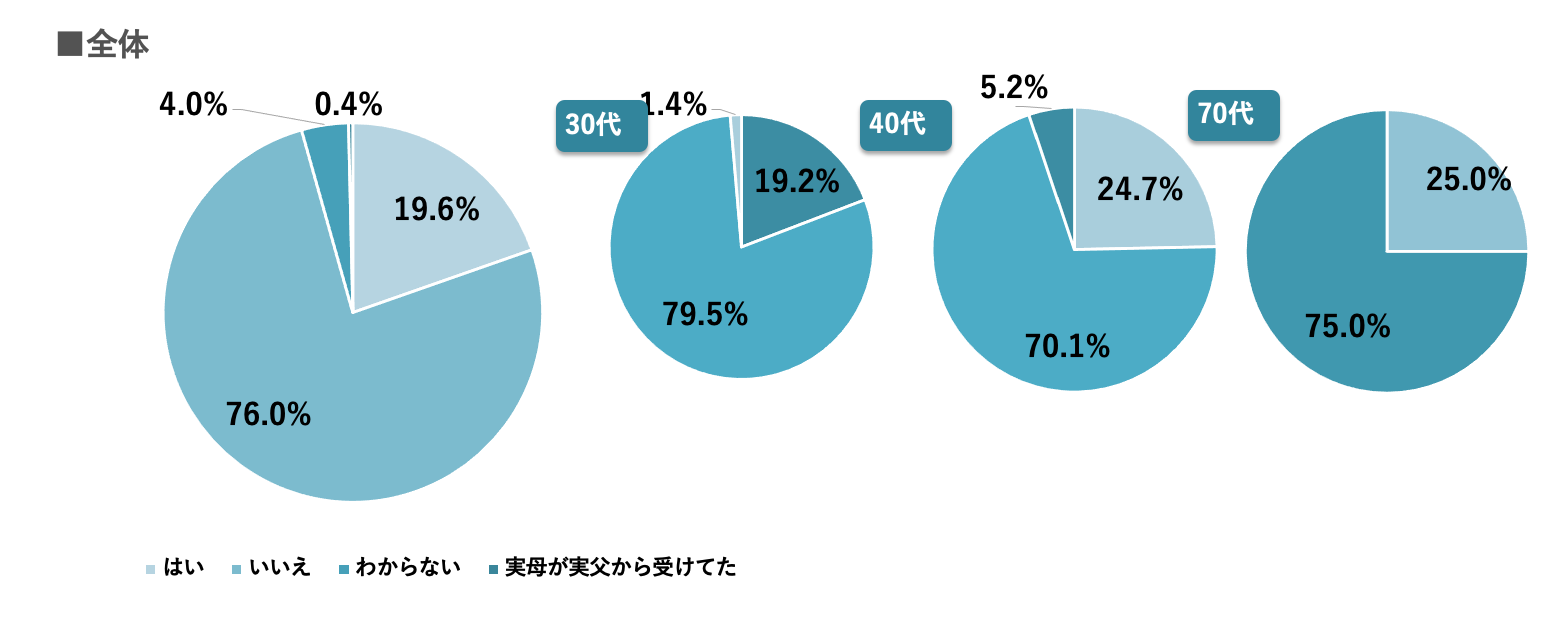 全体的にみると、「はい」または「実母が実父から受けていた」が20%という結果になりました。どの年代も「いいえ」の回答が70~80%という結果にはなっていますが「はい」の回答が一定数いるのは見過ごせません。30代になると「はい」の割合が少し増えていますが、これは結婚して間もなかったり結婚して数年経っていたりするため、見えなかったイヤなところや本性が見られるようになったのかもしれません。40代になるとさらに「はい」の割合が約25%に増加し、「いいえ」の割合が各年代別ワースト1位になってしまっています。50代になると「いいえ」が約80%まで回復しますが自身ではなく「実母が実父から受けていた」が約20%となり自身ではなく家庭内で行われていたことが窺えます。60代になると「はい」が約20%、70代になるとさらに「はい」の割合が25%にまで増えてしまっています。60代、70代になると、若者の介護疲れや夫婦間での介護疲れなどから、つい手をあげてしまうことがあるのかもしれないと考えられます。