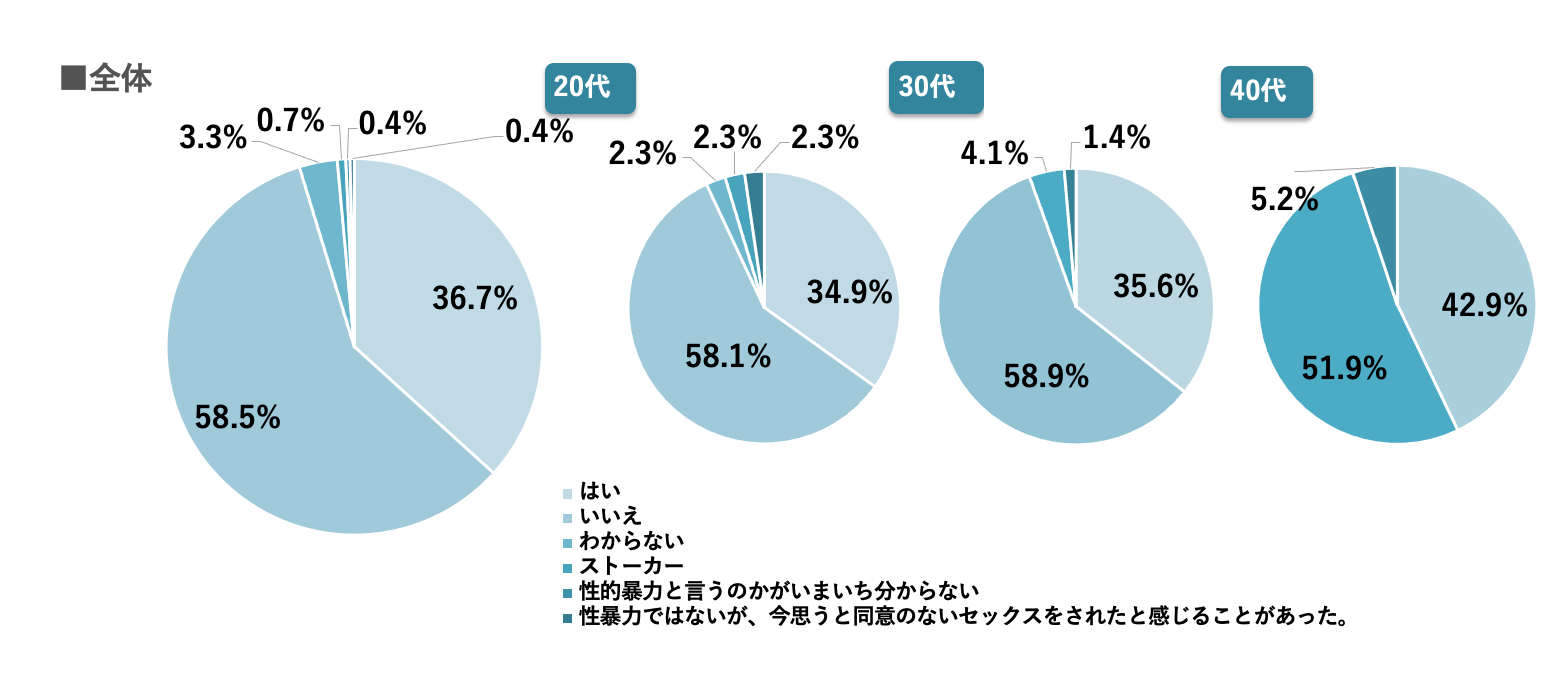 ◆性暴力被害などに合った経験あり全体の約40%、10代のストーカー被害は約20%