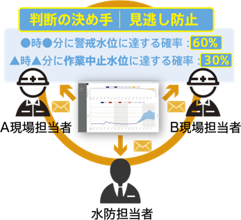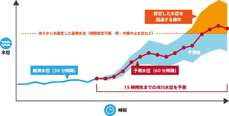 PCやスマートフォンのブラウザから手軽に利用でき、公的情報や他社サービスからは得られない、河川に特化した情報を提供します。天気予報の誤差を考慮した河川水位予測情報を 15 時間先まで提供するほか、行動指標とされる任意の基準水位を超過する確率も定量的に把握できます。また予測水位や超過確率に基づき、メールでアラート情報を受け取ることも可能です。