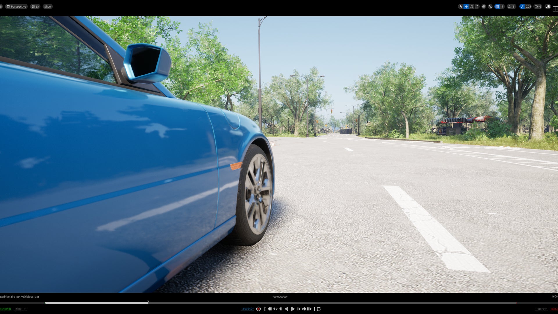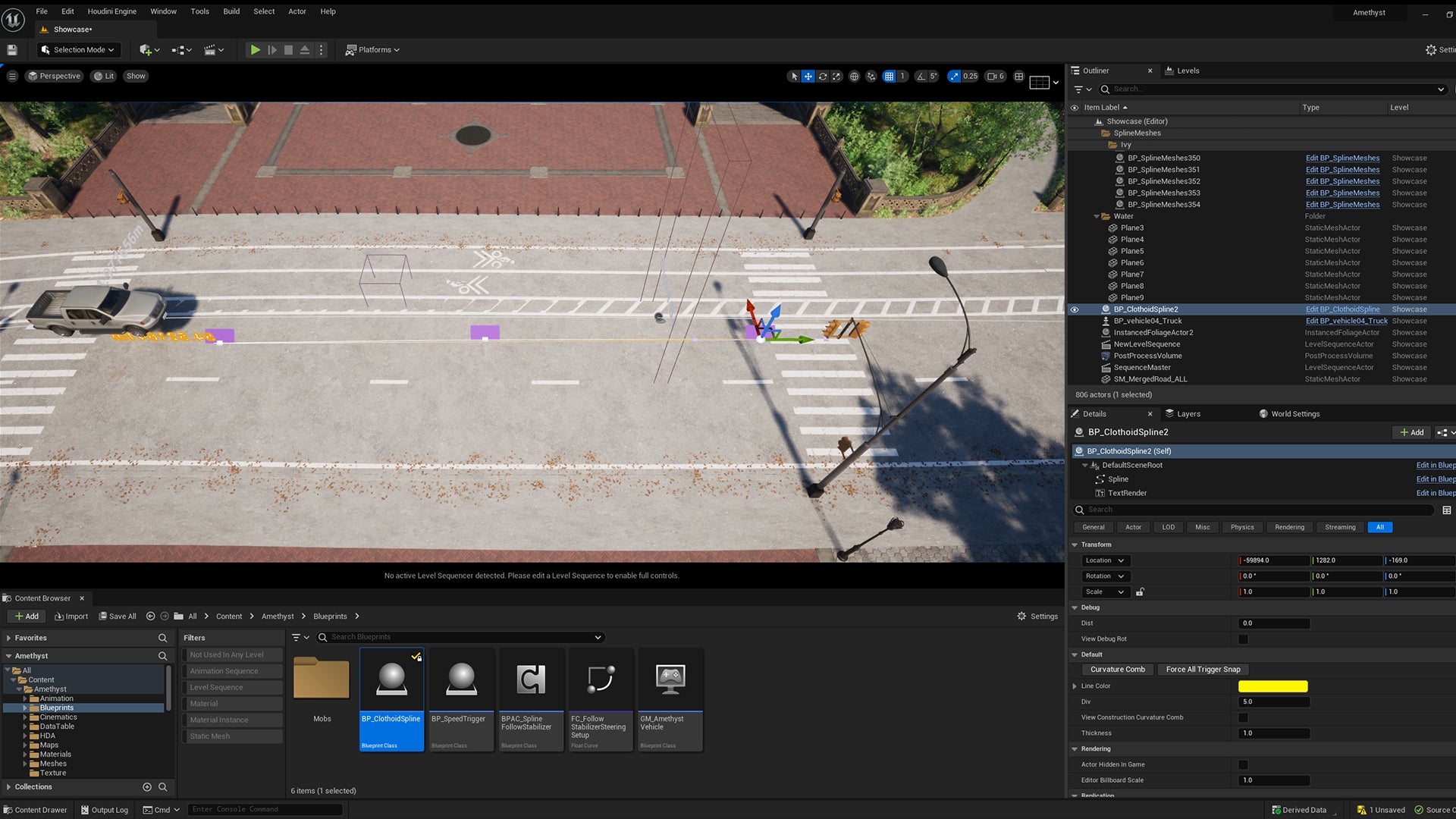 「Custom Path Driving System」は手動で道路にパスを引き、それに沿ってタイヤの方向や物理的な車体の沈み込みを再現しながら自動走行するシステムです。UE5標準機能でも物理的な自動車挙動を再現するものは存在しますが、基本的には自分で運転することを想定しており、任意のパスに沿わせて走行することや、それをもとに思い通りの映像を作ることは困難でした。