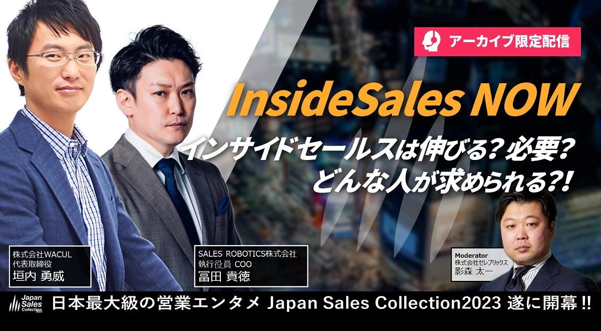 アーカイブ特別コンテンツでは、「BtoBマーケティングの定石」シリーズの著者である株式会社WACULの垣内 勇威 氏と、多くの企業のインサイドセールスを支援しているSALES ROBOTICS 冨田 貴徳が「インサイドセールスの今」をテーマに、マーケティングや営業との認識の違い、役割、目標の持ち方など様々な角度から、第三者から必要とされる優秀なインサイドセールスについて議論します。
