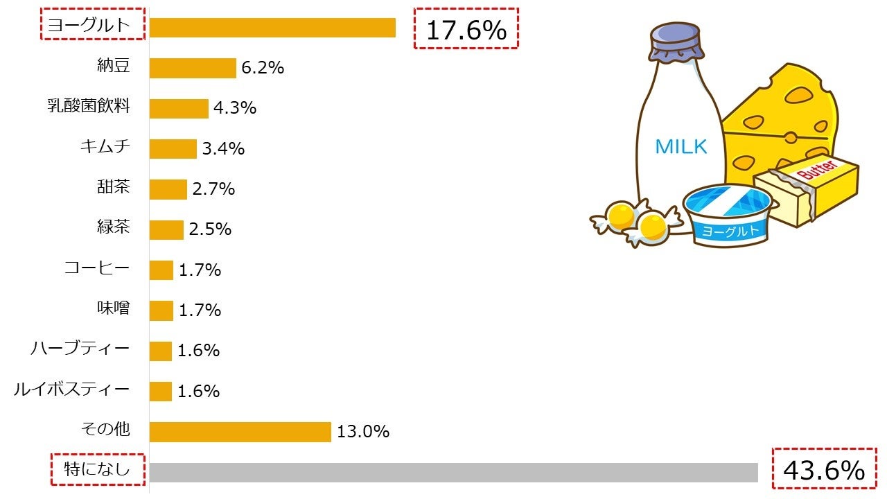 - 花粉症対策に効果的とされる食べ物・飲み物、最も多かった回答は「特になし」
