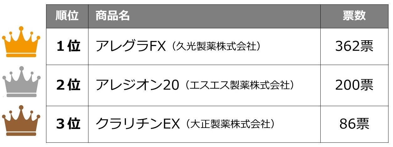 「アレグラFX」が362票を獲得し、現役の医師の皆様から圧倒的な支持を集めました。