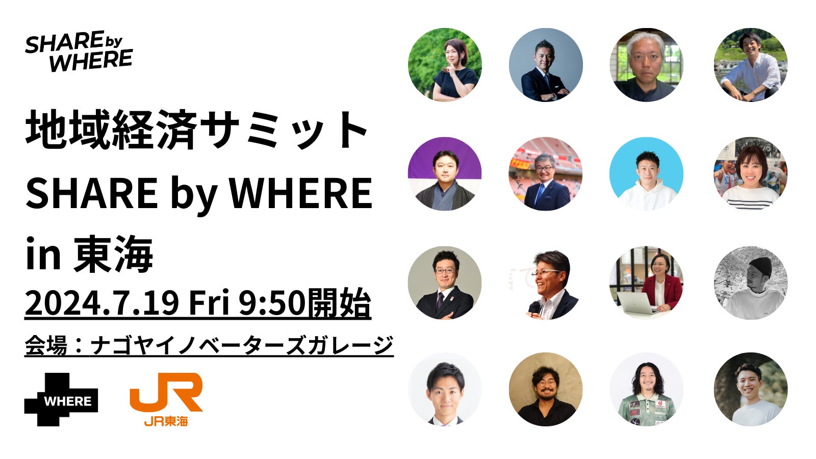 株式会社WHERE(本社:東京都千代田区神田、代表:平林和樹)・東海旅客鉄道株式会社(本社:愛知県名古屋市中村区名駅、代表:丹羽俊介)の2社は、東海エリアで経済を動かす起業家・首長・公務員・大学教授など合わせた約20名をスピーカーとして迎える地域経済サミット「SHARE by WHERE in 東海」を、愛知県名古屋市にて2024年7月19日(金)に開催いたします。