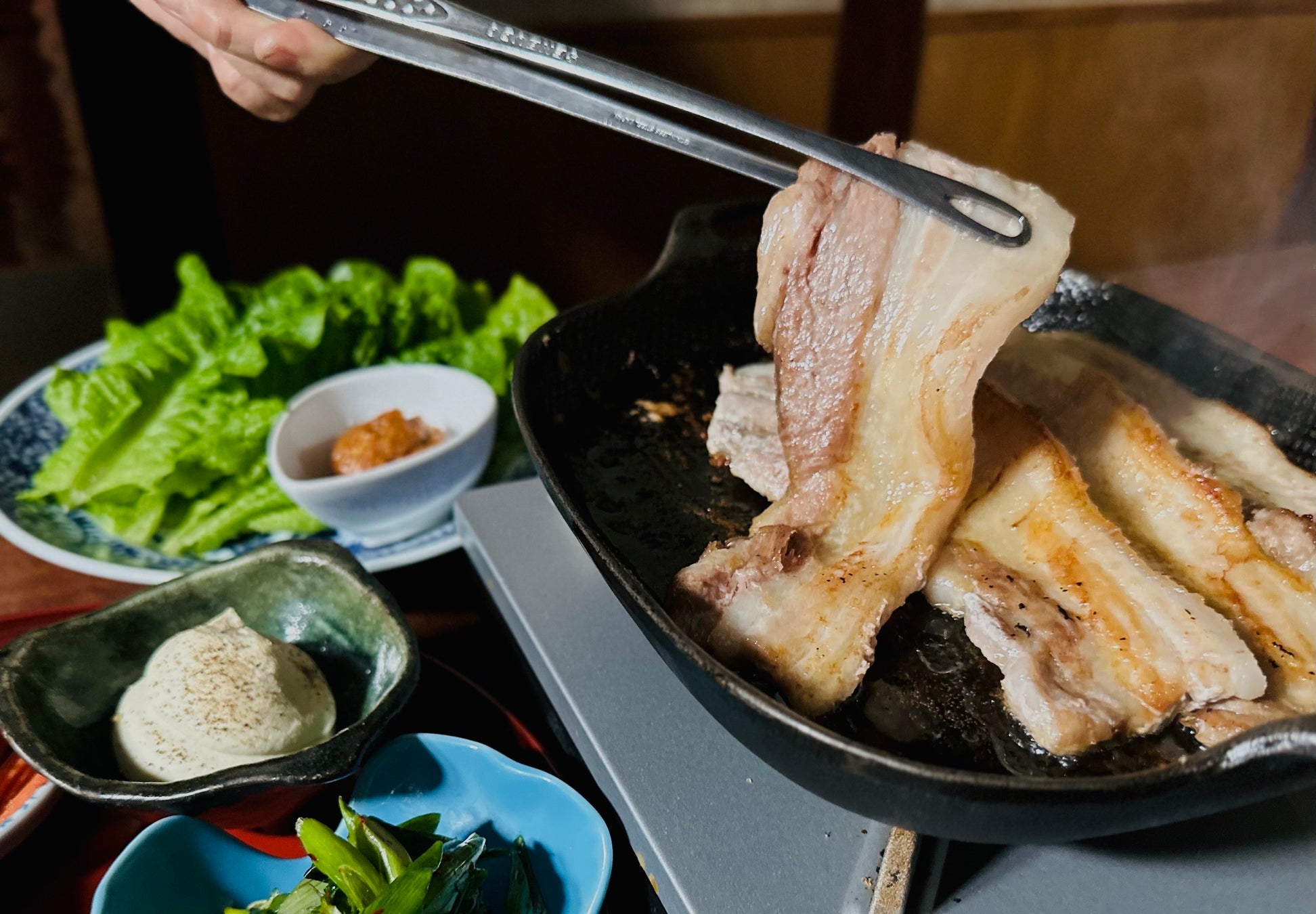サムギョプサルを京風にアレンジ!九条葱や聖護院大根、京人参など京都の食材を使用した京風ナムルと、ケグリ特製の秘伝の味噌(ヤンニョム)を用いた自家製サムジャンを一緒に、サンチュに包んでお召し上がり下さい。