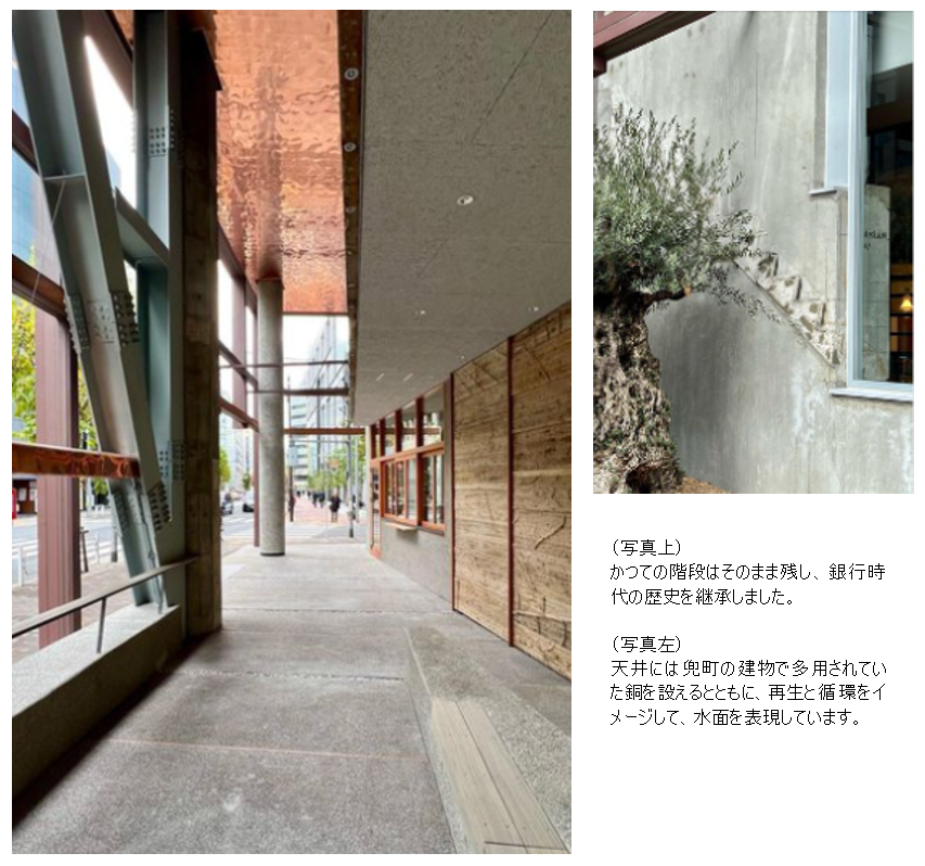外壁ラインを1面セットバック(減築)して、パブリック空間を設けるとともに、「平和」の象徴である推定樹齢1,000年を超えるオリーブを配置しています。ここが兜町に集う人々の憩いの場所となることが期待されます。