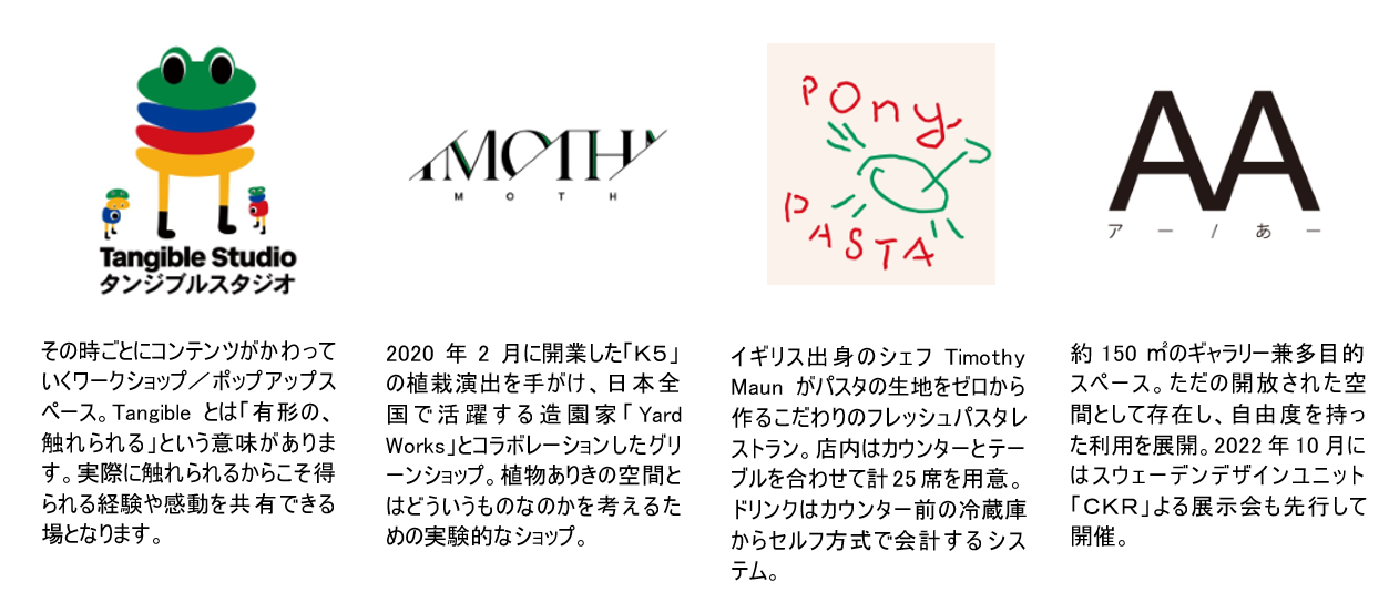フレッシュパスタレストラン(Pony Pasta)、グリーンショップ(MOTH)、ワークショップ/ポップアップスペース(Tangible Studio)、ギャラリー/多目的スペース(AA)の複合