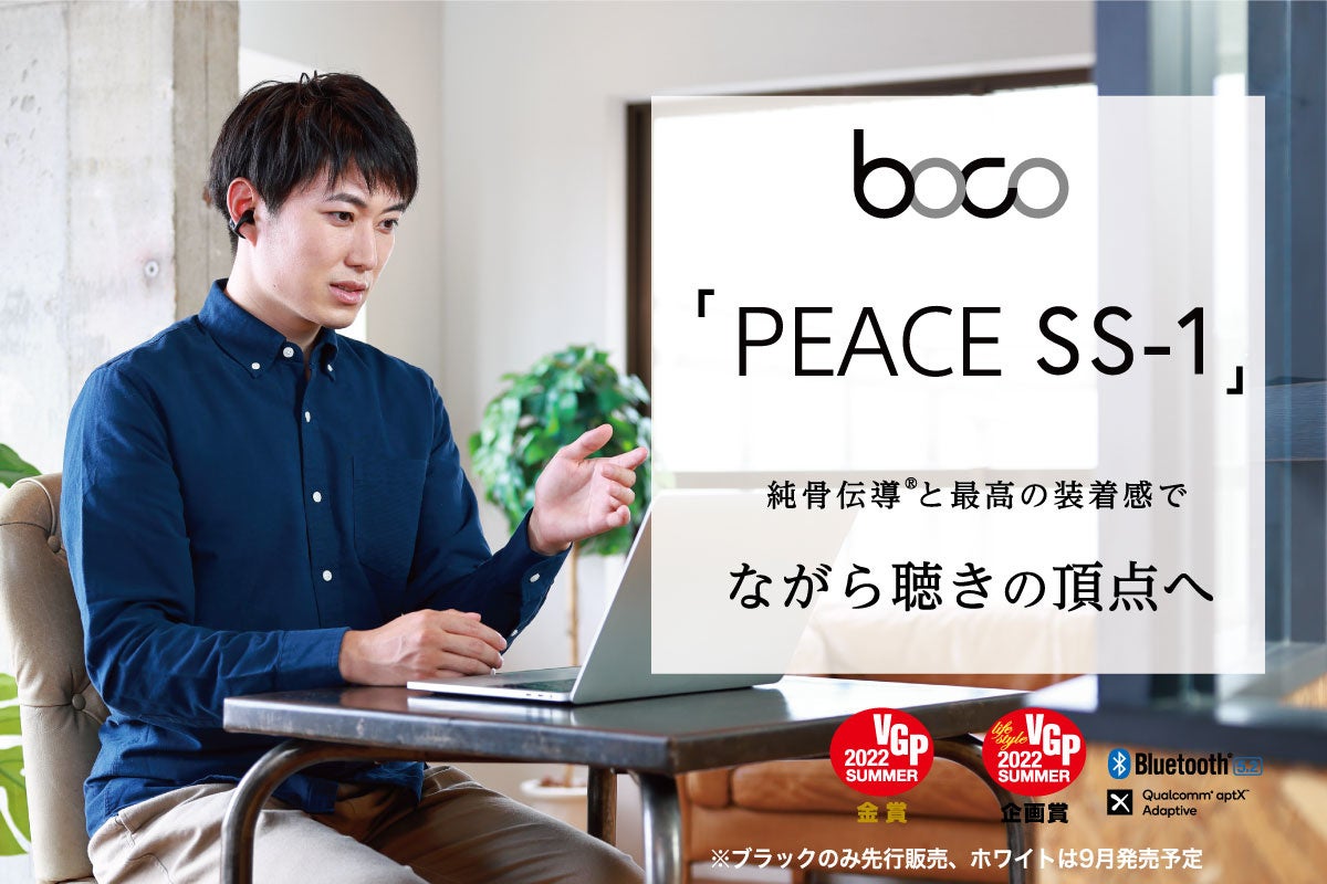発明特許取得済みの骨伝導デバイスを独自開発の全自動量産設備により東京都大田区の自社工場で一貫生産し、日本発の骨伝導商品開発を手がけるBoCo株式会社(本社:東京都中央区、代表取締役社長:謝端明)は、8月26日より鼓膜を使わずに音を聴く純骨伝導®テクノロジーの最新機種となる、世界初・日本発左右完全独立型骨伝導イヤホン(Bone Phone®)『PEACE SS-1』の一般販売を、公式ストア(BoCoオンラインショップ、boco STORE銀座)ならびに大手家電量販店およびソフトバンクショップ(一部店舗を除く)を中心とした、全国のBoCo製品取扱店で開始いたします。(ブラックのみ先行発売、ホワイトは9月発売予定)