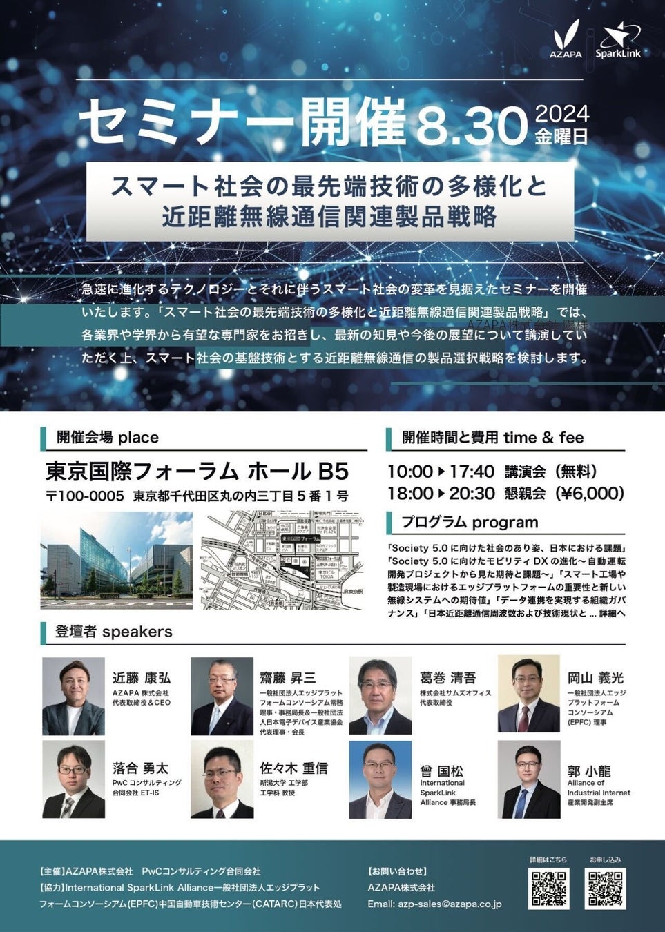 本セミナーでは、スマート社会の実現に焦点を当て、現状と課題、イノベーション技術の事例に触れ、産学各界から本領域の第一人者をお招きし、様々な観点から現状と課題、対応策についてご講演頂くことと合わせて、新世代の近距離通信技術SparkLinkを日本国内にて初めてご案内いたします。