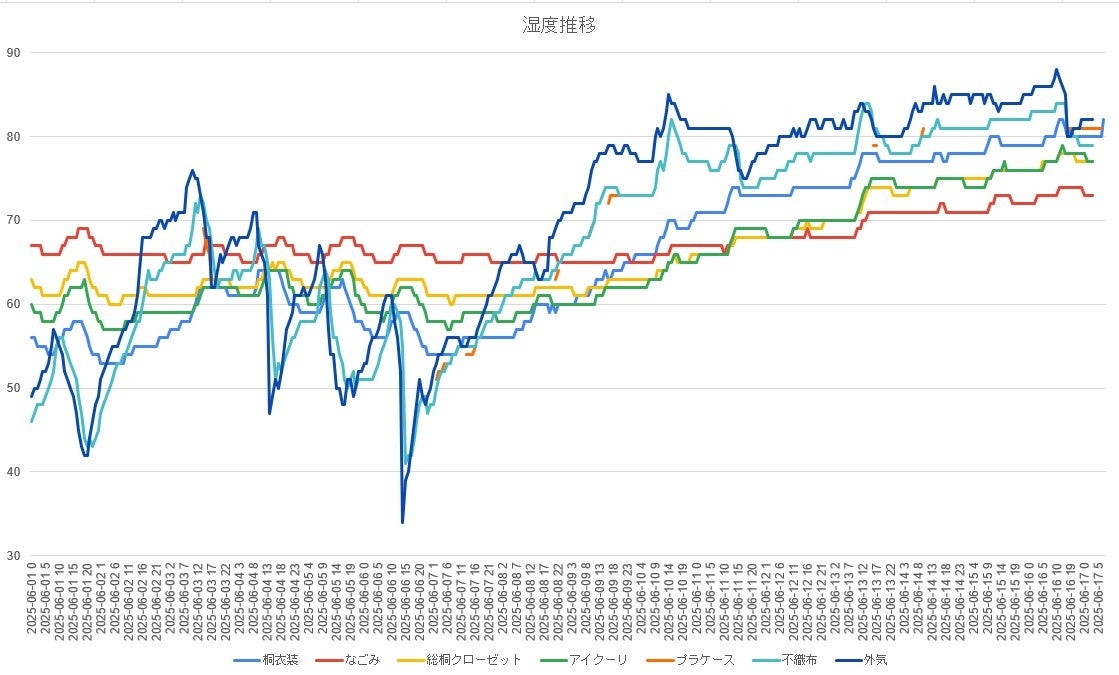 革靴のカビ、衣類のニオイ、バッグの型崩れ――これらの原因の多くは「湿度」。株式会社大川家具ドットコム(所在地:福岡県大川市)は、こうした梅雨シーズンに多く寄せられる「収納内の湿気」に関する声に応えるべく、同社倉庫内で7種類の収納家具と外気の湿度環境を約2週間にわたり実測・可視化しました。
