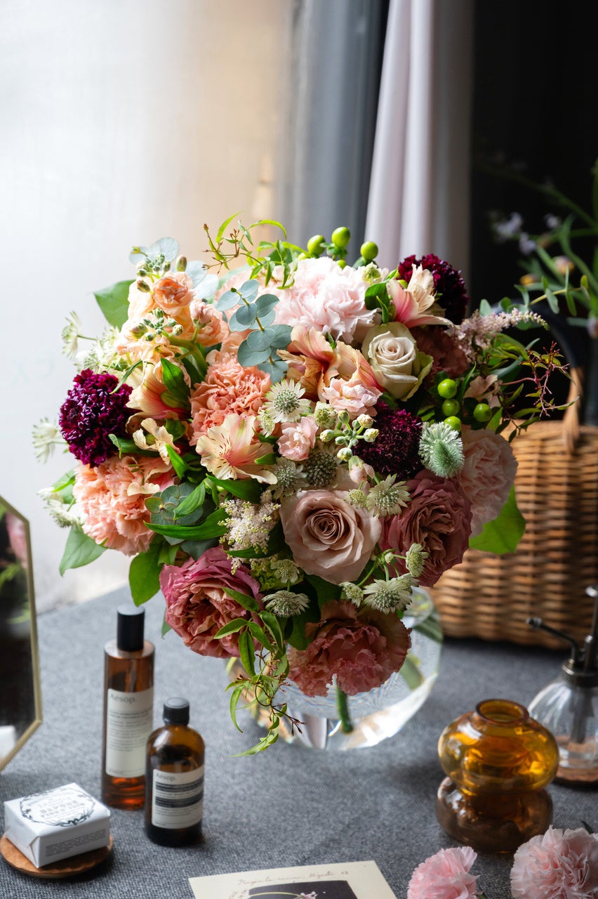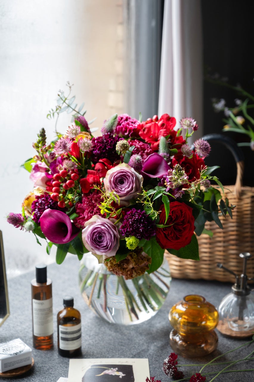 色とりどりのカーネーションやバラをメインに束ねた大人気シリーズ。深みのある上品なくすみカラーの「Rouge」、カラフルで個性的な「Sunlit」、数量限定アレンジメント「Velvet」等のバリエーションで展開しております。