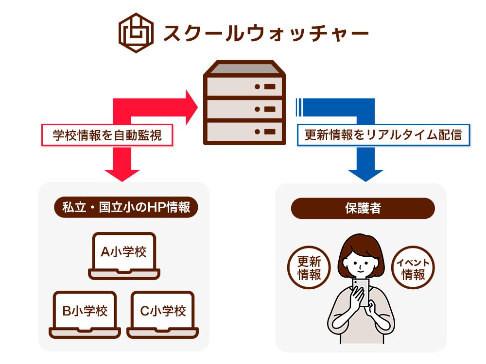 「スクールウォッチャー」は、学校のホームページを定期的に確認し、更新情報を保護者様にリアルタイムで通知する新しいサービスです。学校見学会や運動会などの重要なイベント情報をいち早くキャッチすることで、機会損失を防ぎ、より効率的な受験準備をサポートいたします。