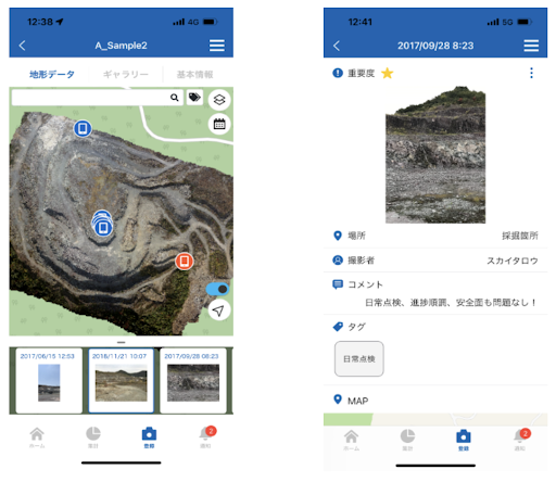 この両機能が融合することで、現場の「地図」自体をデータ管理のための図面とし、これまでバラバラに管理されていたドローン測量データと写真・動画データを、一括管理することが可能となり、誰でも、いつでも、迷うことなくデータを確認・管理することができます。