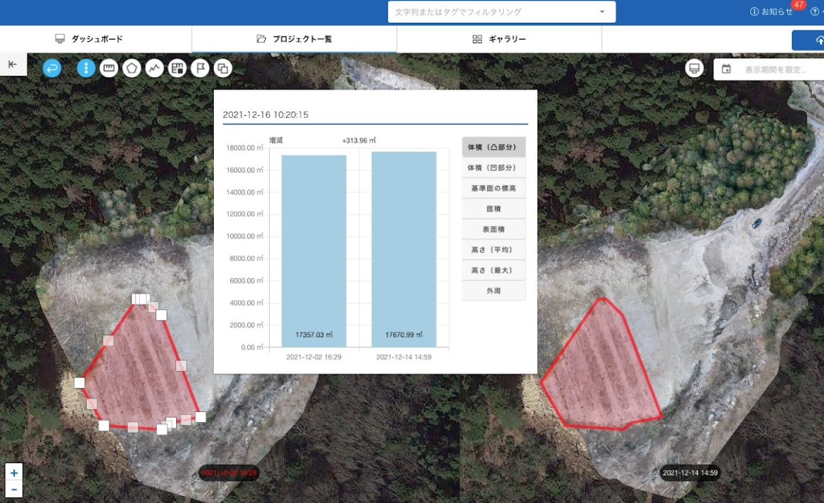 GCP(Ground Control Point:座標がわかっている地上点)や測量機器を使わずに、画像処理解析のみで二時期の位置をピタリと重ね合わせることができる独自の「位置補正機能」と最大で4時期の同一エリアの土量などの差分などを自動で計算し、経年変化による「自動比較機能」を業界で唯一実装。