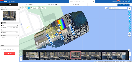 地図上に生成されたオルソ画像の上に、ドローンやスマホで撮影した位置情報付きの写真や動画を保存できます。保存したデータはマップ上にアイコンで表示されるので、撮影したデータの位置情報の記録・説明をする必要はありません。コメントやタグもつけられるので、現場の詳細な情報をすぐに簡単に共有することができます。